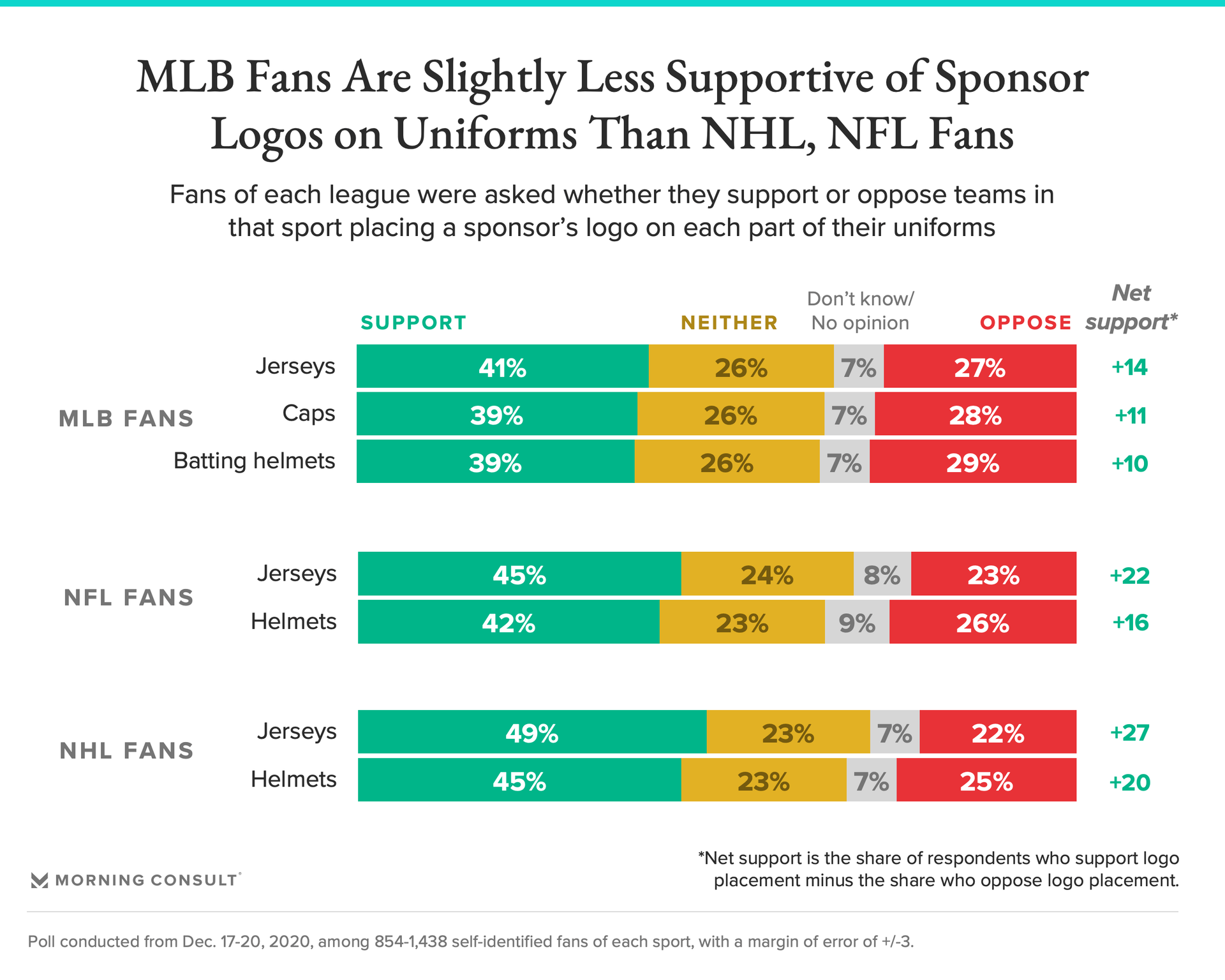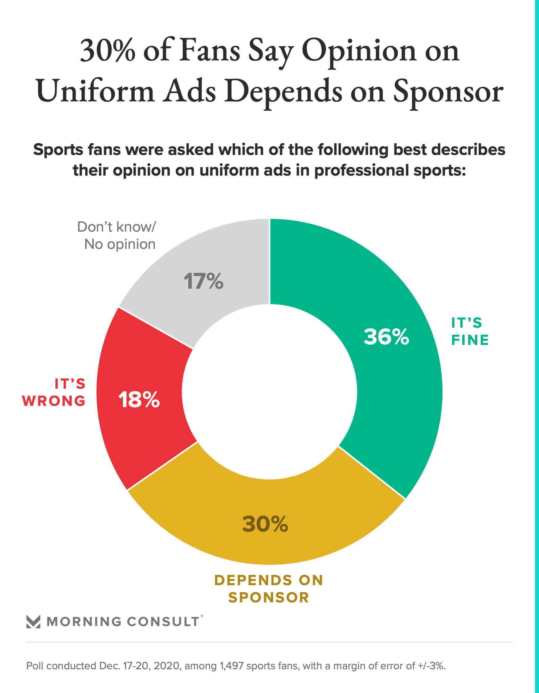 In a recent Morning Consult poll, 34 percent of self-identified sports fans said they supported teams placing a sponsor’s logo on athletes’ uniforms, while another 32 percent said they neither supported nor opposed corporate branding on uniforms. Only 24 percent of fans expressed opposition to teams putting a sponsor’s logo on uniforms.