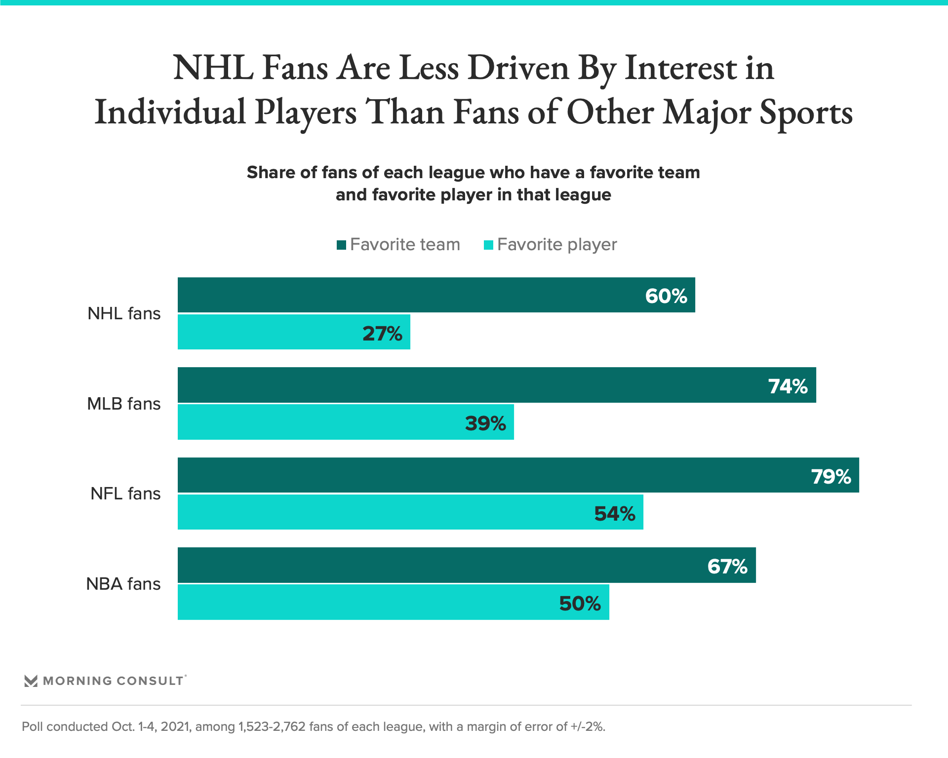 Brown’s characterization of NHL fandom as especially team-driven is supported by the results of a Morning Consult survey conducted this month, in which self-identified NHL fans were less likely than fans of the other three major North American team sports to say they have a favorite player.