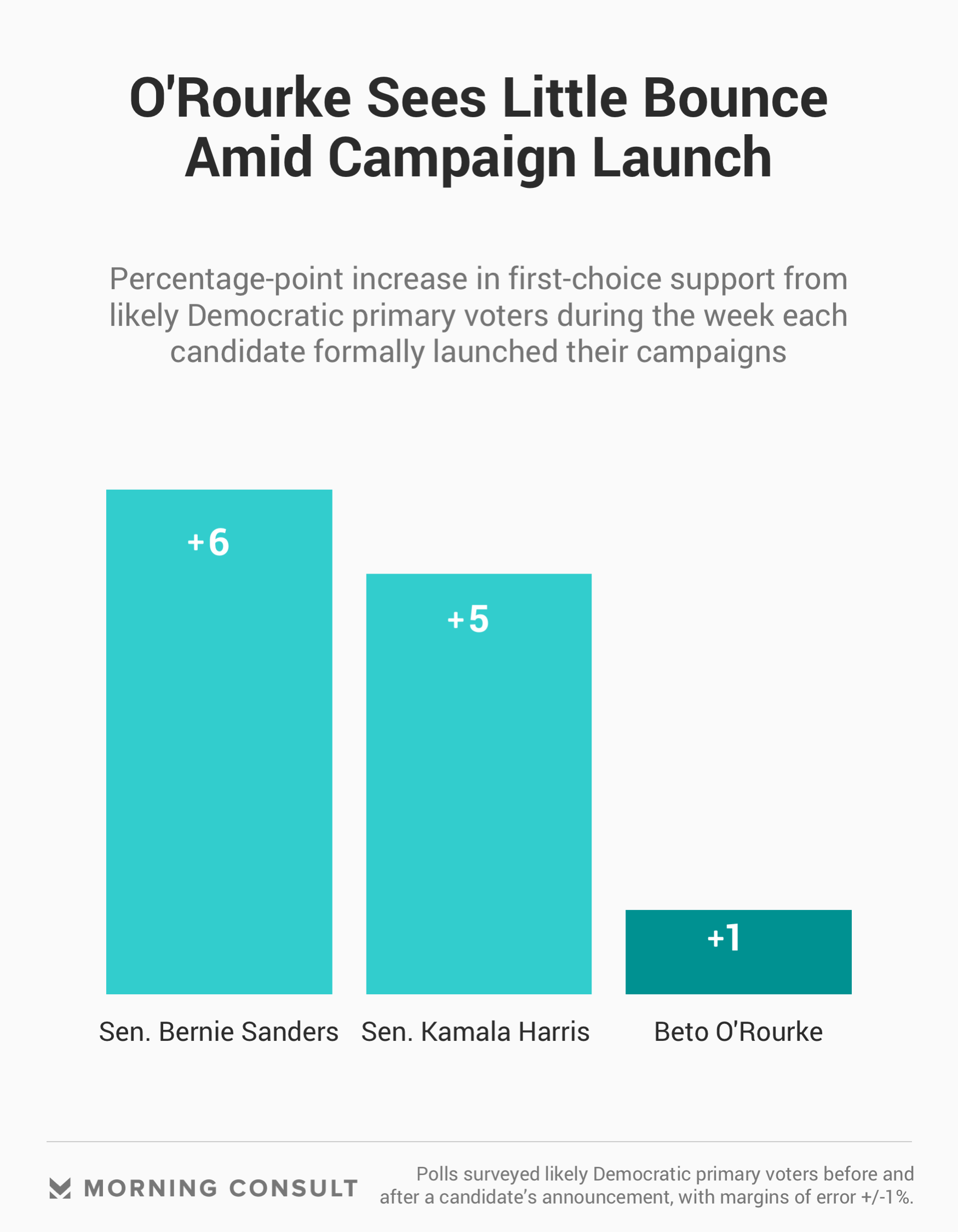 News of Sanders’ campaign announcement, which until O’Rourke’s launch had attracted the most first-day donations among Democratic candidates, appears to have reached more Democratic voters than O’Rourke’s, according to Morning Consult/Politico polling. After Sanders’ announcement, 80 percent of Democratic voters said they had heard “some” or “a lot” about it, compared with 63 percent who said the same about O’Rourke’s announcement.