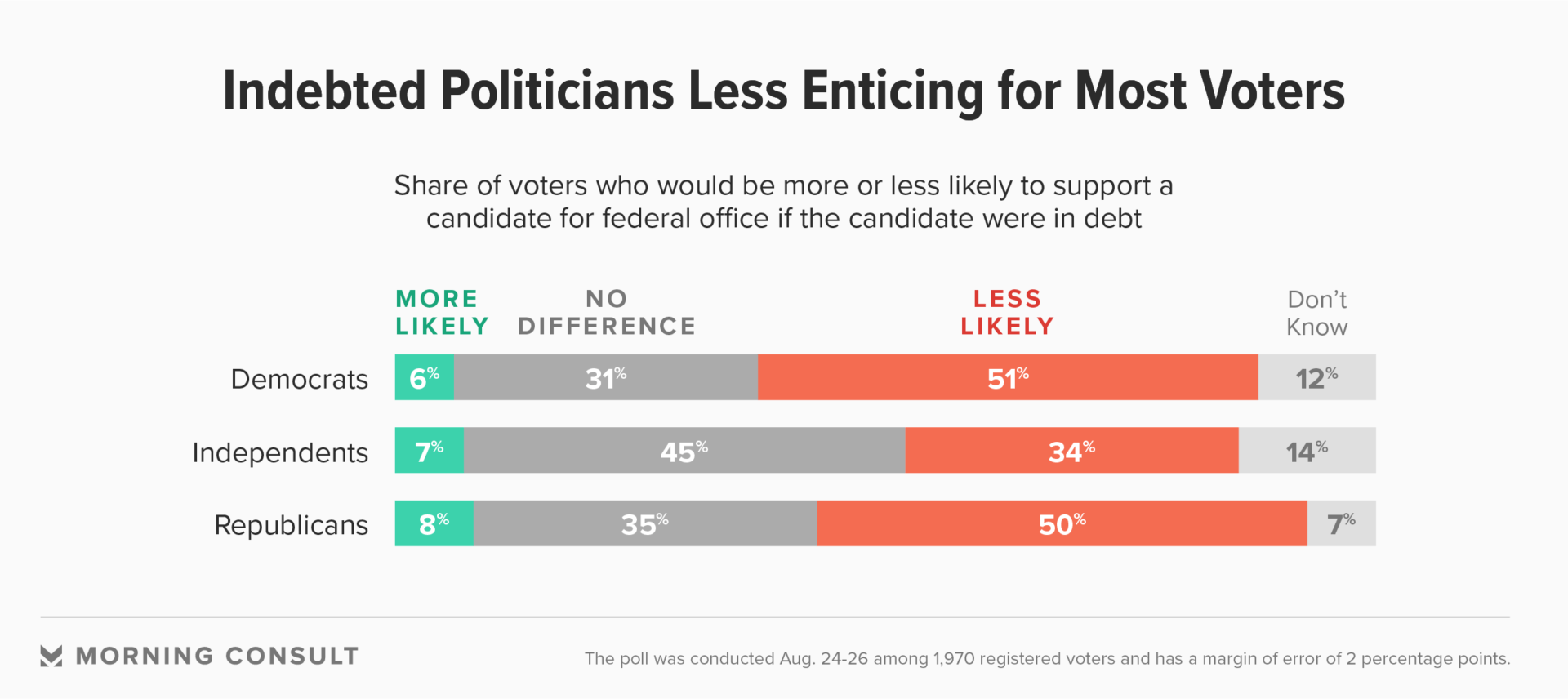 That GOP message against indebted candidates may resonate, according to a Morning Consult survey that asked 1,970 registered voters from Aug. 24-26 whether various personal traits would make them more or less likely to vote for someone.