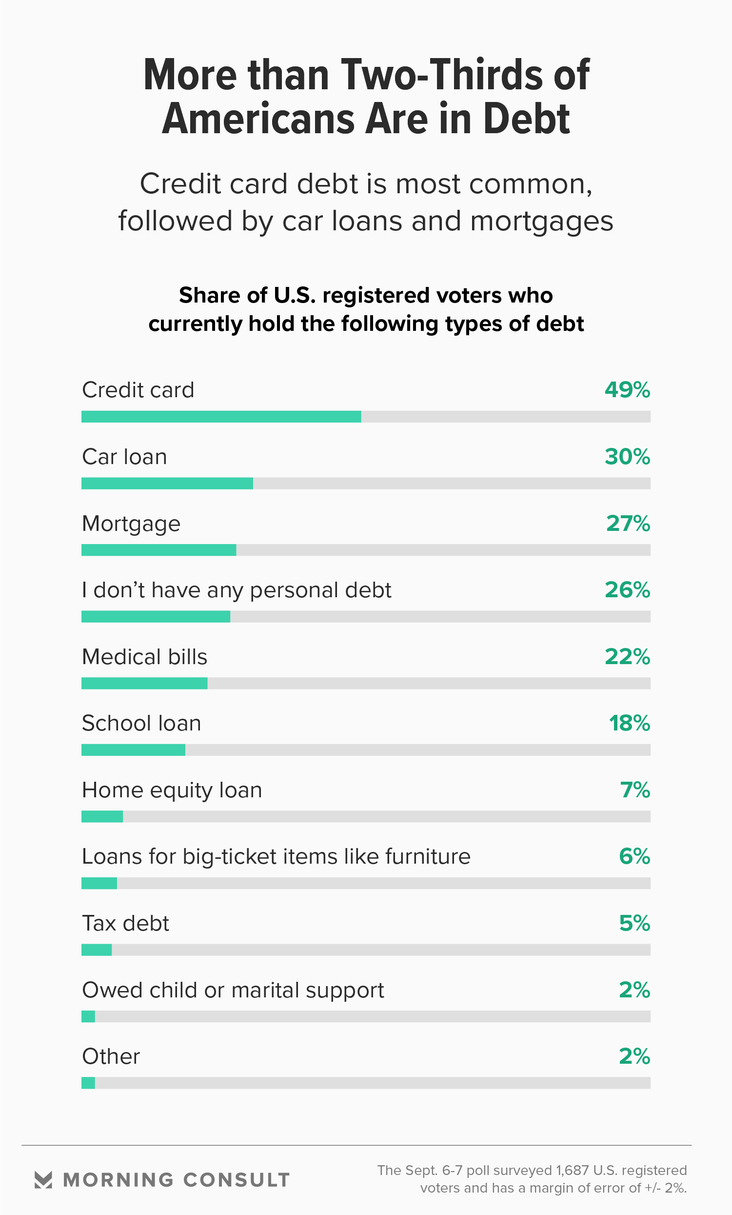 But most people hold some kind of debt: A separate Morning Consult survey of 1,687 voters from Sept. 6-7 found that just 26 percent said they had no personal debts.