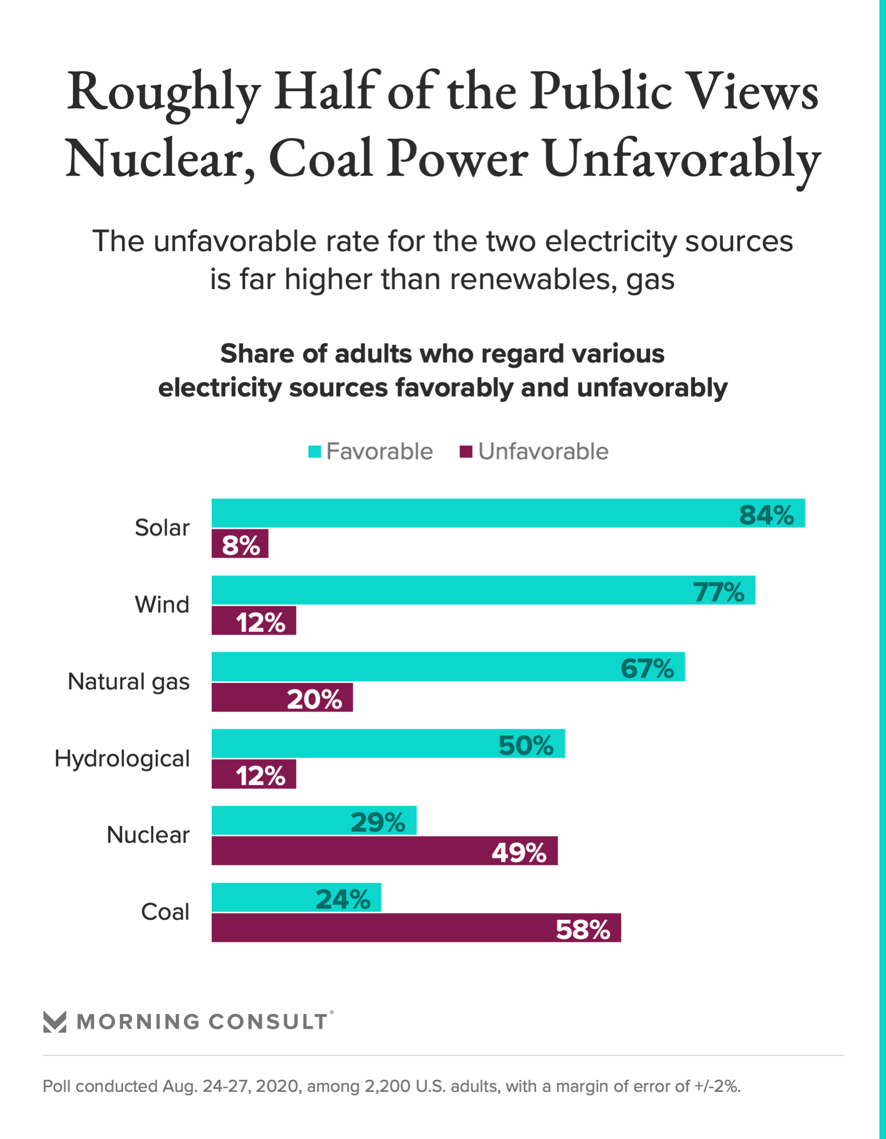 - 29% view nuclear energy favorably and 49% view it unfavorably, making it the most unpopular energy source other than coal.