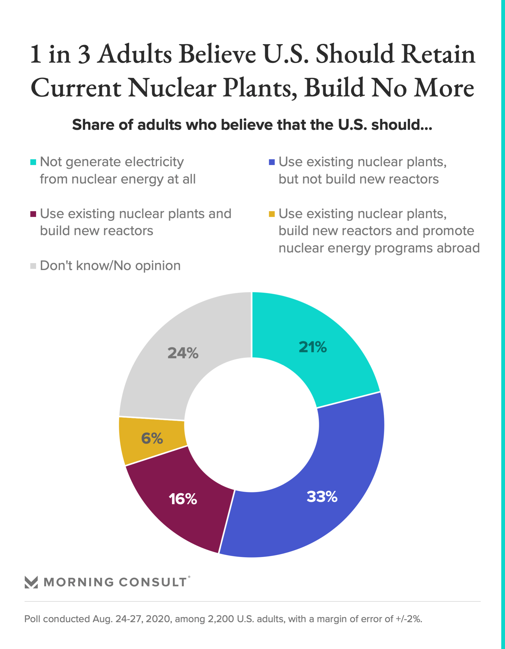 - 1 in 3 adults think the U.S. should keep current nuclear plants online but not build any new facilities.