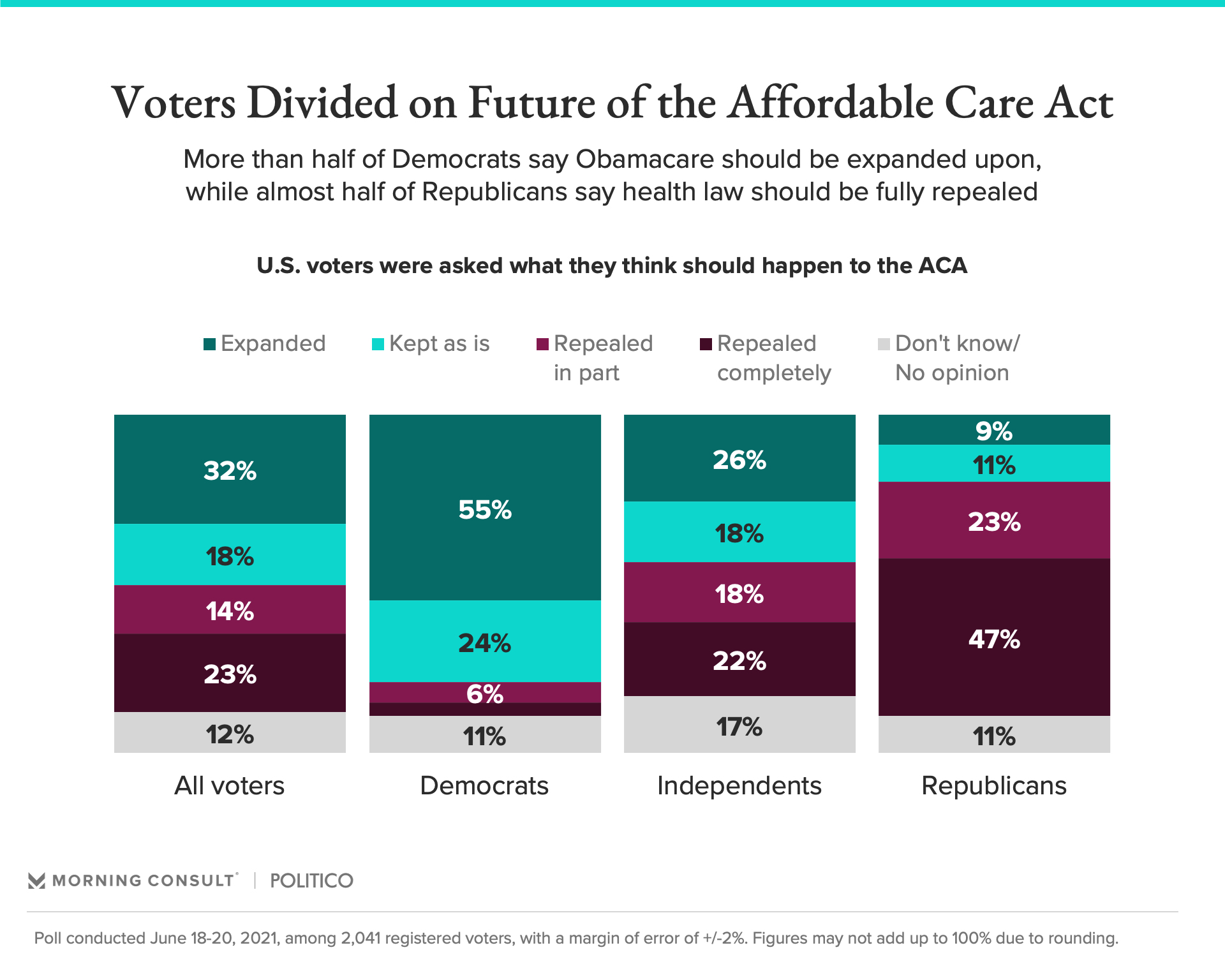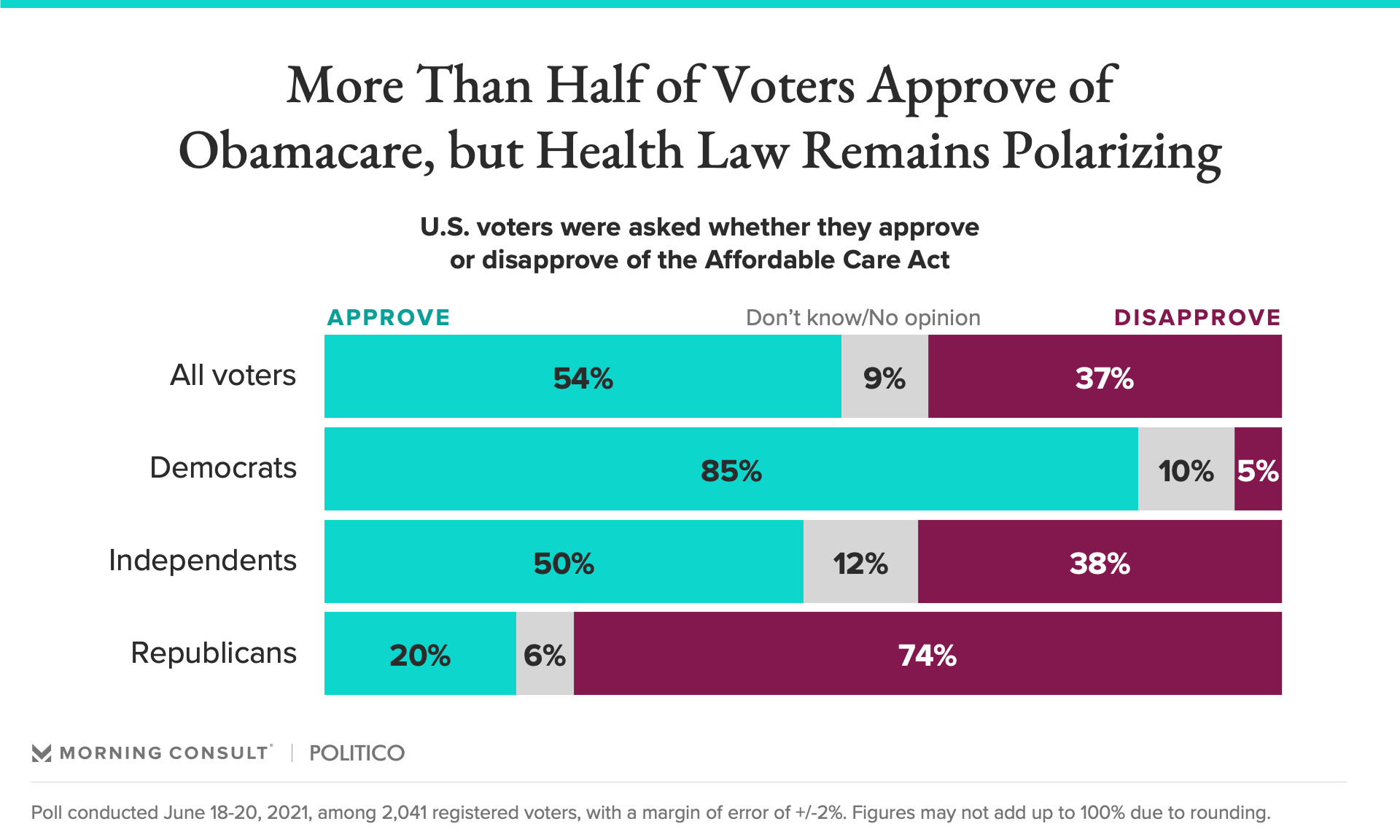 New Morning Consult/Politico polling indicates 54 percent of U.S. voters either strongly or somewhat approve of the ACA, while 37 percent oppose it and 9 percent said they don’t know or have no opinion of the law also known as Obamacare. Those figures are in line with longstanding trends in Morning Consult polling, and indicate the health law remains wildly unpopular among Republican voters even as it emerges unscathed from its latest challenge before the high court.