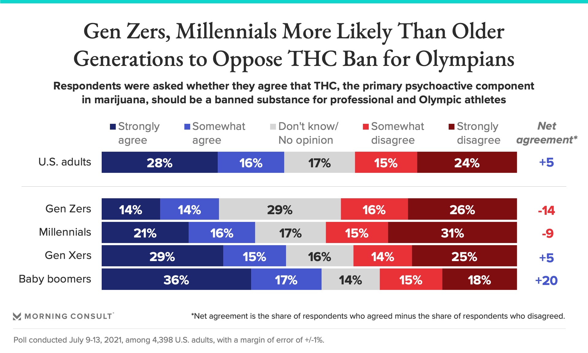 Among baby boomers, for instance, 53 percent of respondents agreed that THC should be a banned substance, while 33 percent disagreed. Gen Zers, on the other hand, were more likely to oppose than support WADA’s ban on THC by a margin of 42 percent to 28 percent.