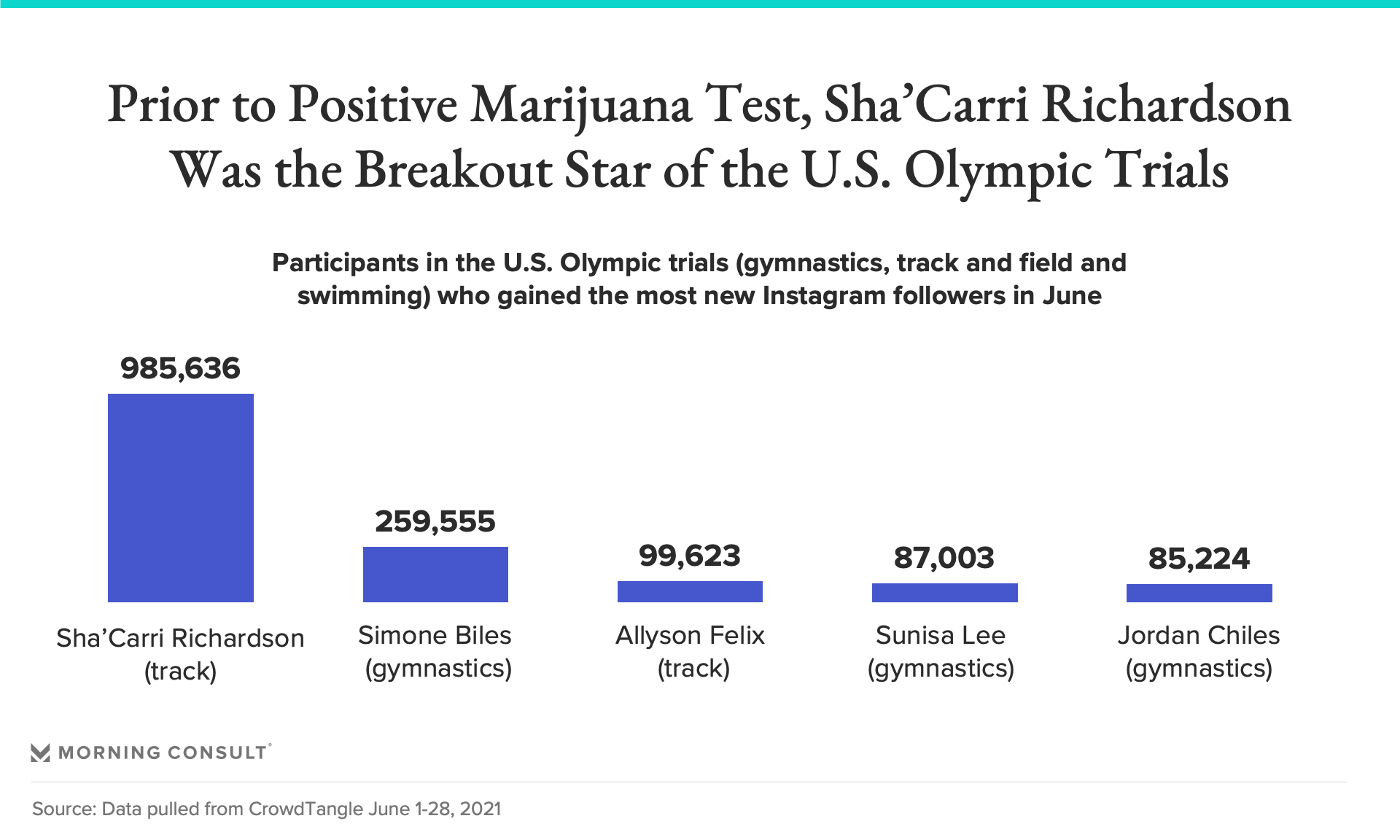 According to data from CrowdTangle, a Facebook Inc.-owned measurement platform, Richardson gained nearly a million Instagram followers in June, more than any other athlete participating in the U.S. Olympic trials for gymnastics, swimming and track and field, by a wide margin. Her suspension by the USADA became public on July 1.