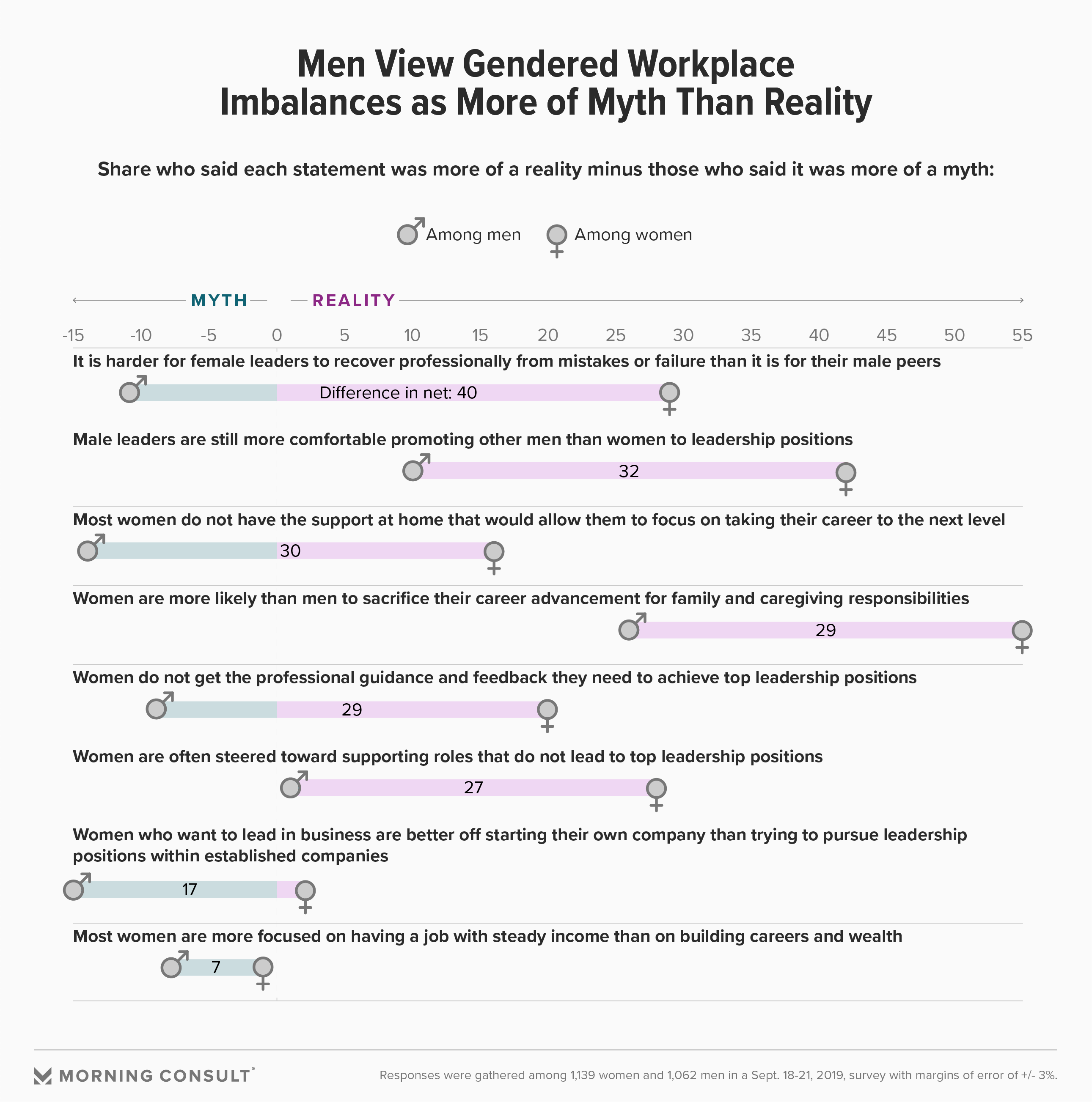 To dive a little deeper into each of these divides, Morning Consult asked the public whether a number of statements about gender inequality in the workplace were more of a myth or a reality -- and pinpointed which exact life moments push people forward, or backward, in their professional lives.