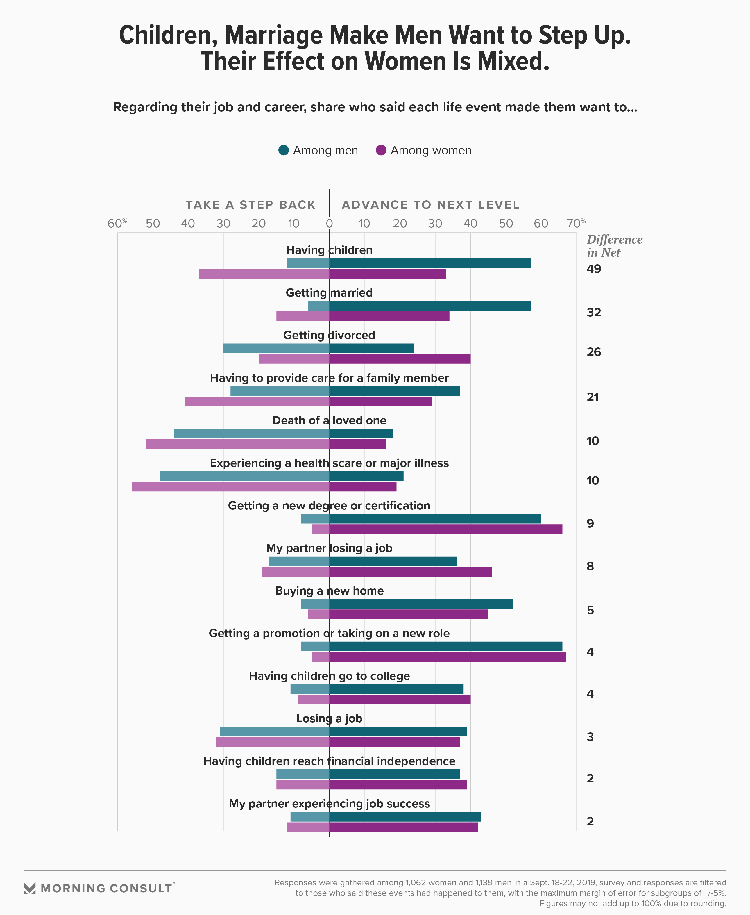 Women were more likely than men, for example, to say having children made them want to take a step back professionally instead of advancing to the next level.