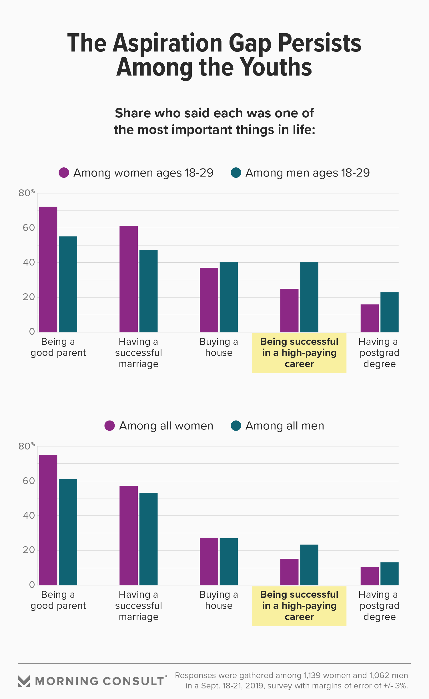 Men ages 18 to 29 are 1.6 times more likely than their female counterparts to say that being successful in a high-paying career is one of the most important things in life, roughly the relationship between all men and all women on the survey question.