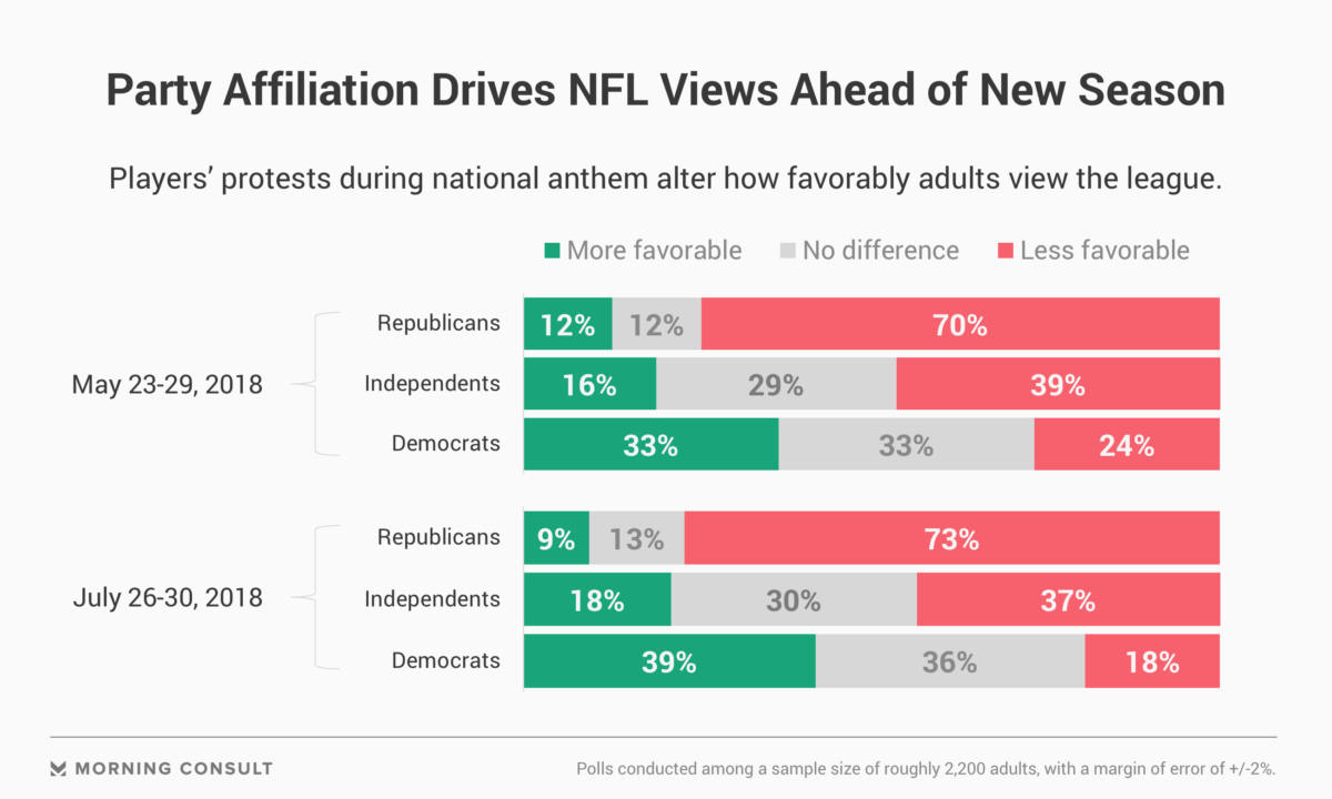 When factoring in the protests, 41 percent of all adults have an unfavorable view of the NFL, close to the figure from May (43 percent). Republicans appear to feel the strongest, with 73 percent in July saying they have a less favorable view of the league in light of the protests.