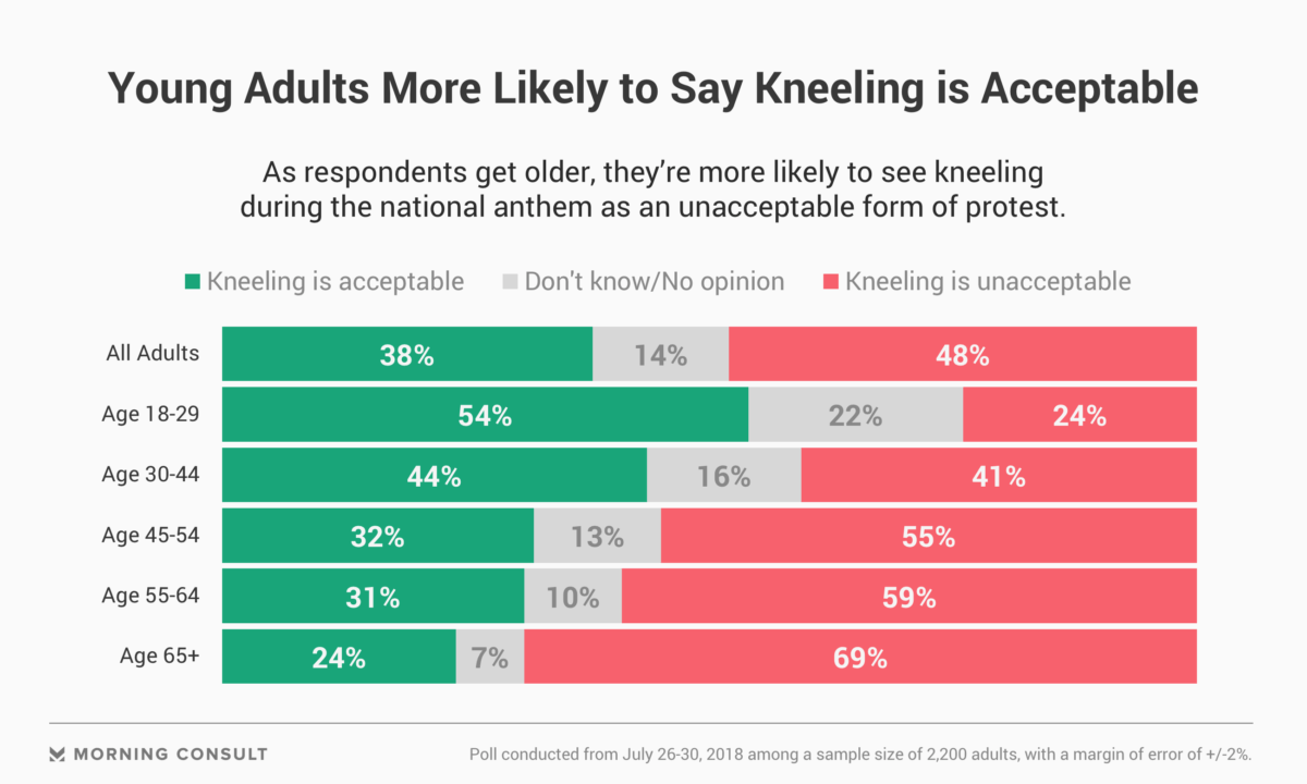 Young adults are more likely (54 percent) to see kneeling during the national anthem as an acceptable form of protest. Support for that idea dwindles as respondents get older, with 69 percent of those age 65 and older believing the act is an unacceptable form of protest.