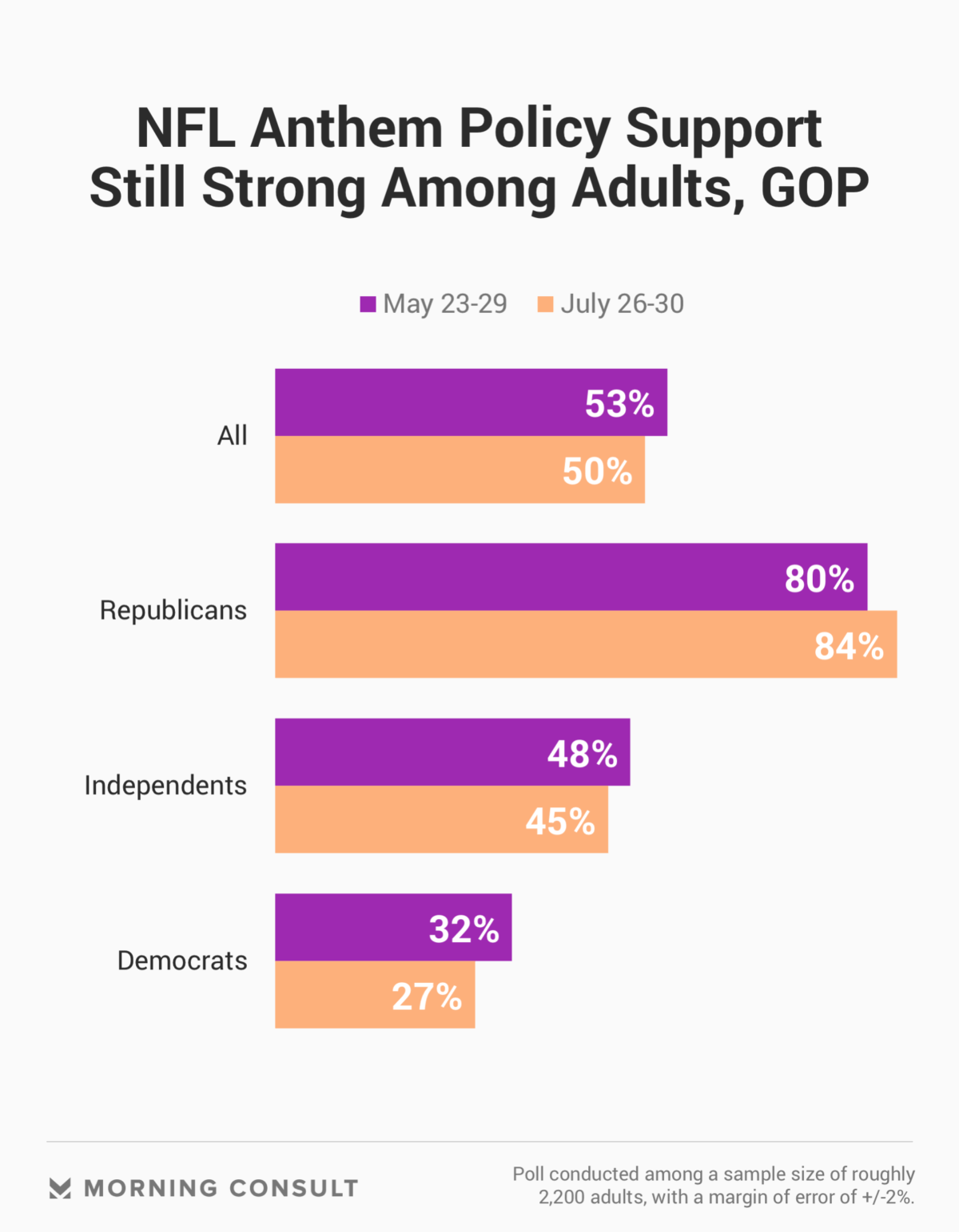 While the NFL’s enforcement of the policy has already changed, a new Morning Consult poll shows that people’s opinions on anthem protests have not changed all that much since last season.