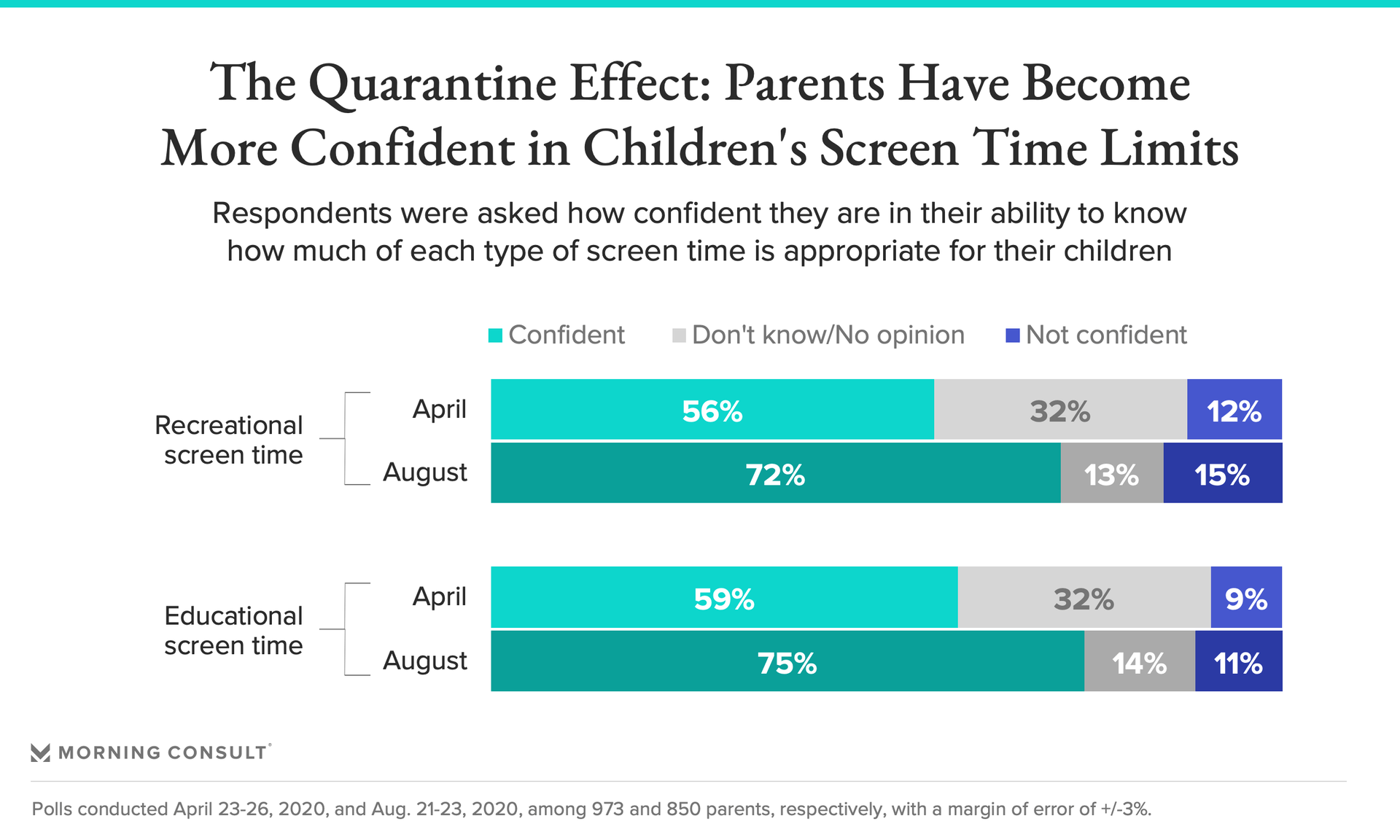 An Aug. 21-23 Morning Consult survey shows a 16-point jump from April in parents who feel confident in knowing the appropriate amount of screen time for recreational purposes (72 percent vs. 56 percent) and a 16-point increase regarding the same for educational purposes (75 percent vs. 59 percent). The August poll and the April 23-26 survey were conducted among parents whose children have access to devices like smartphones, laptops or televisions.