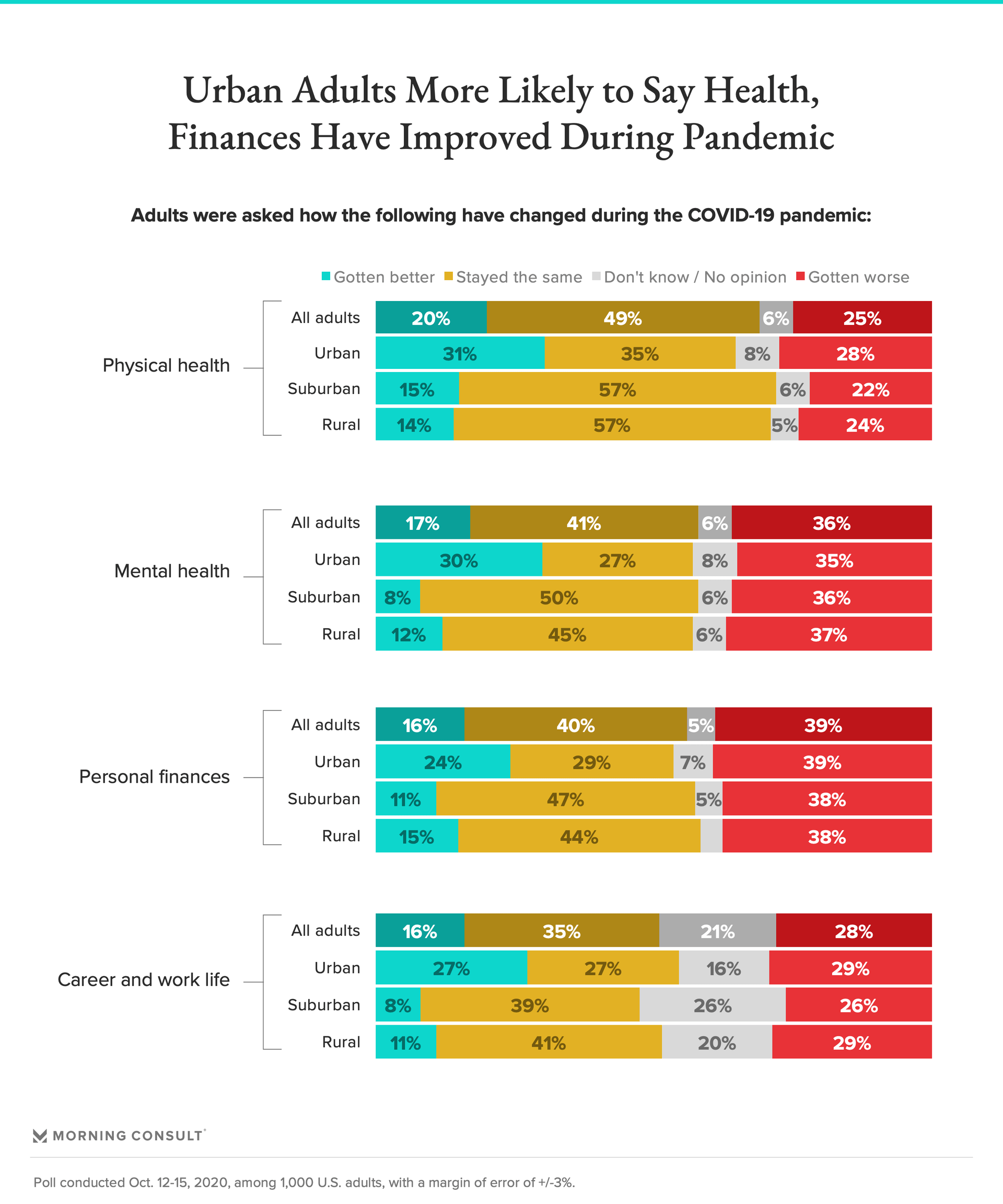 Urban adults are more likely than those in rural areas to report improvements to their relationships, finances and health during COVID-19.