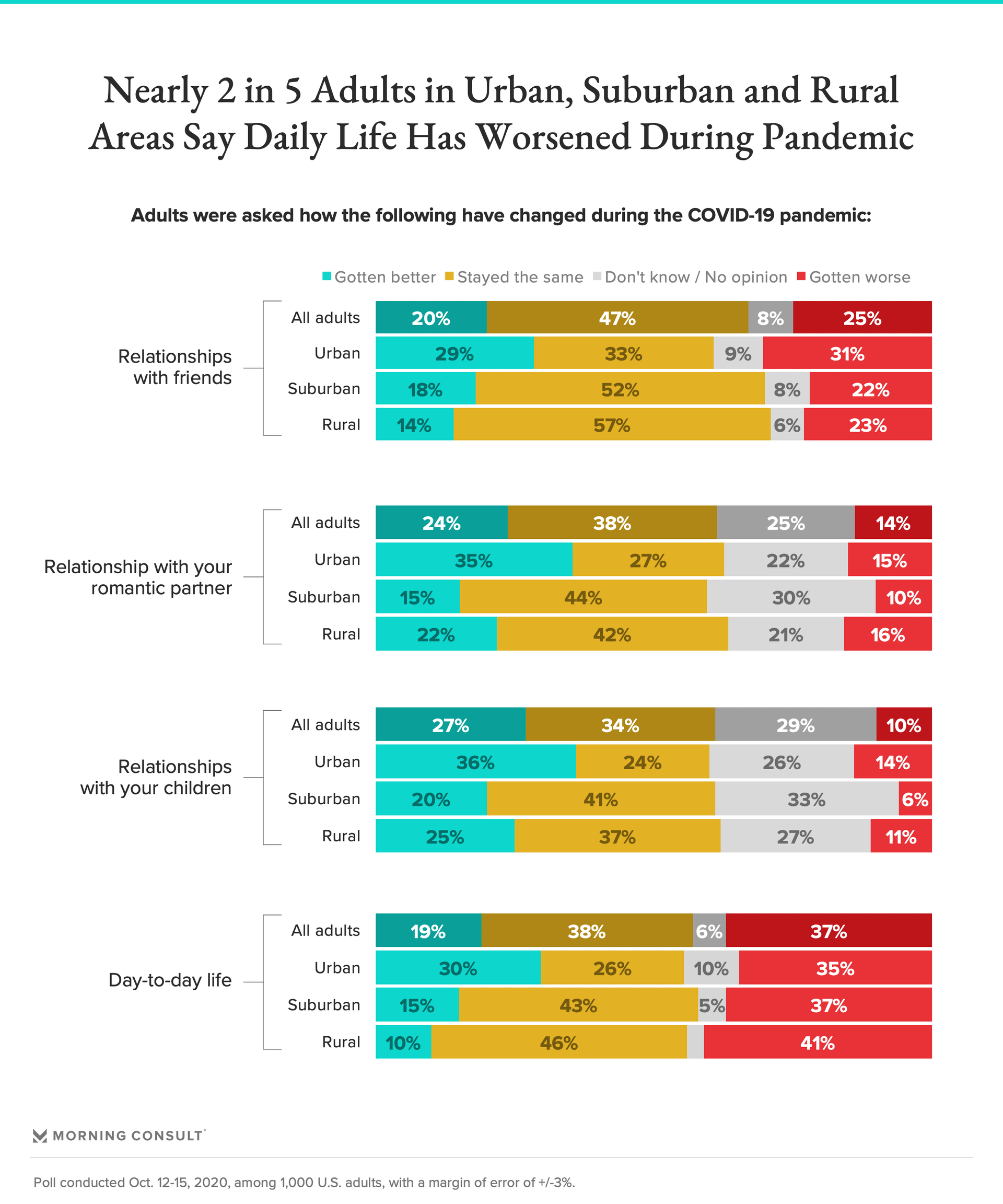 Even so, 19 percent of adults said their day-to-day lives have gotten better during the pandemic in the survey, while 38 percent said there had been no change. People living in urban areas were three times as likely as those in rural America to say their lives have gotten better, 30 percent to 10 percent.