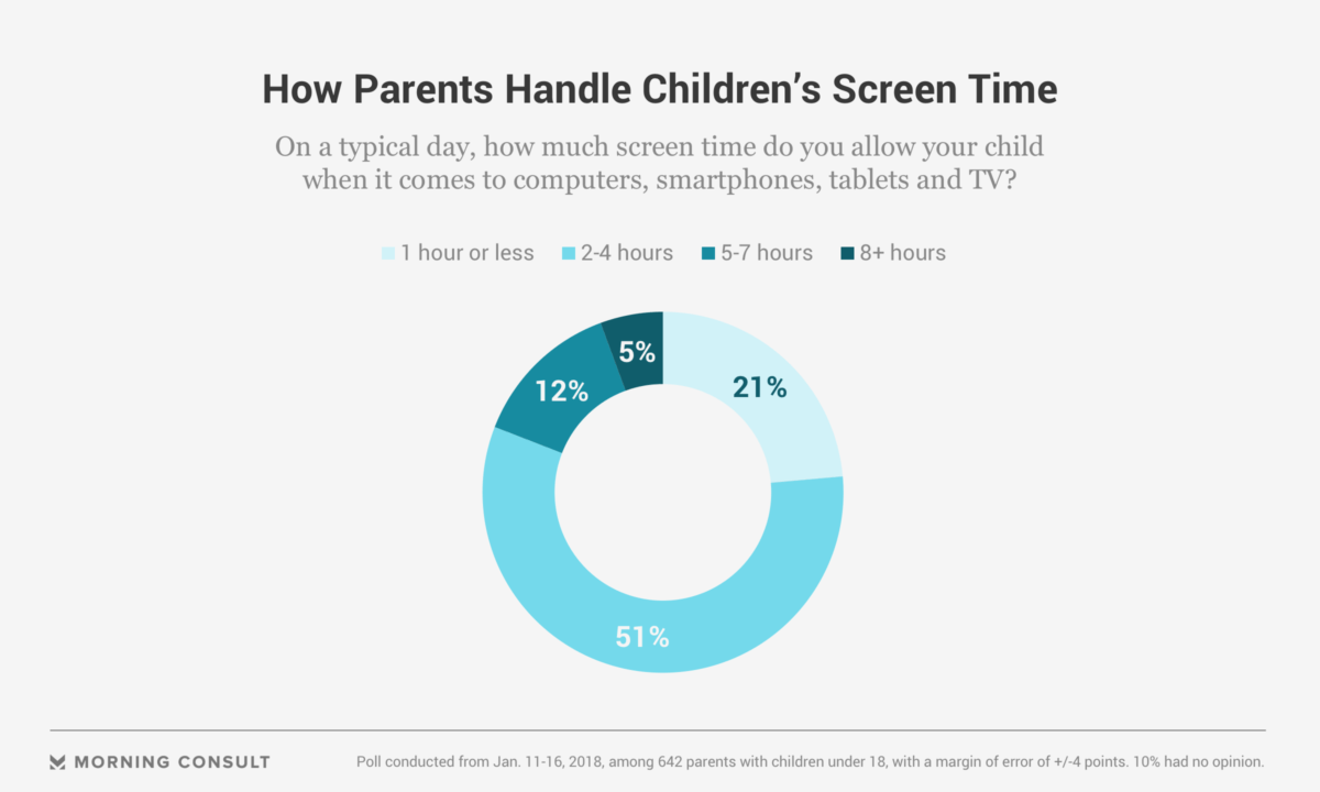 Fifty-one percent said they typically allow their children two to four hours per day with computers, smartphones, tablets and television, while 21 percent said their children get an hour or less of screen time each day.