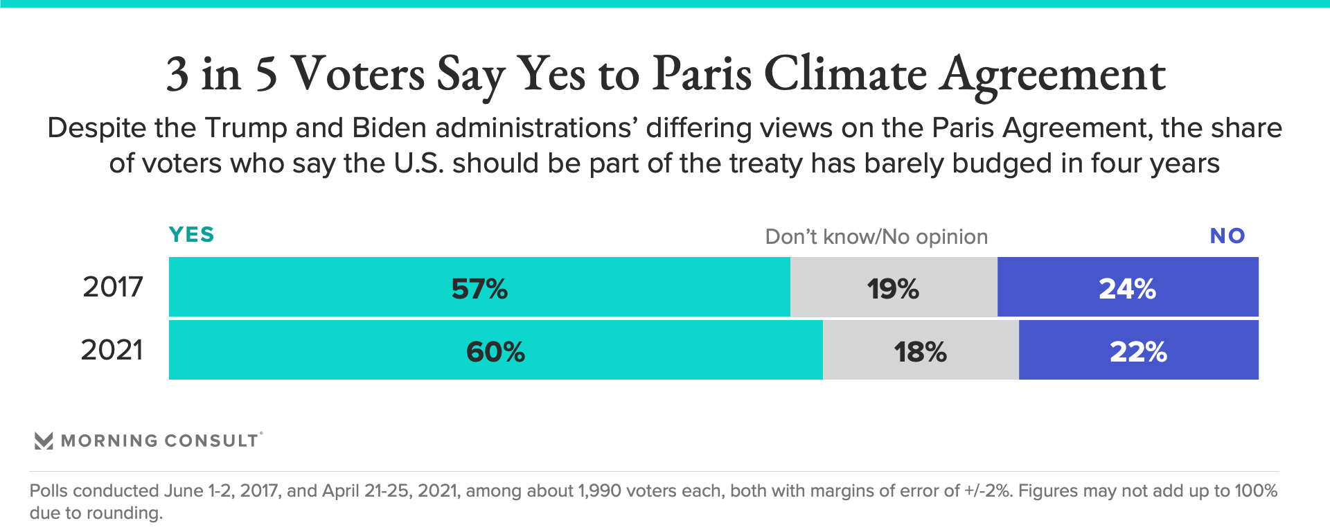 3 in 5 voters said the United States should be a part of the Paris Agreement and about 1 in 5 said it should not.