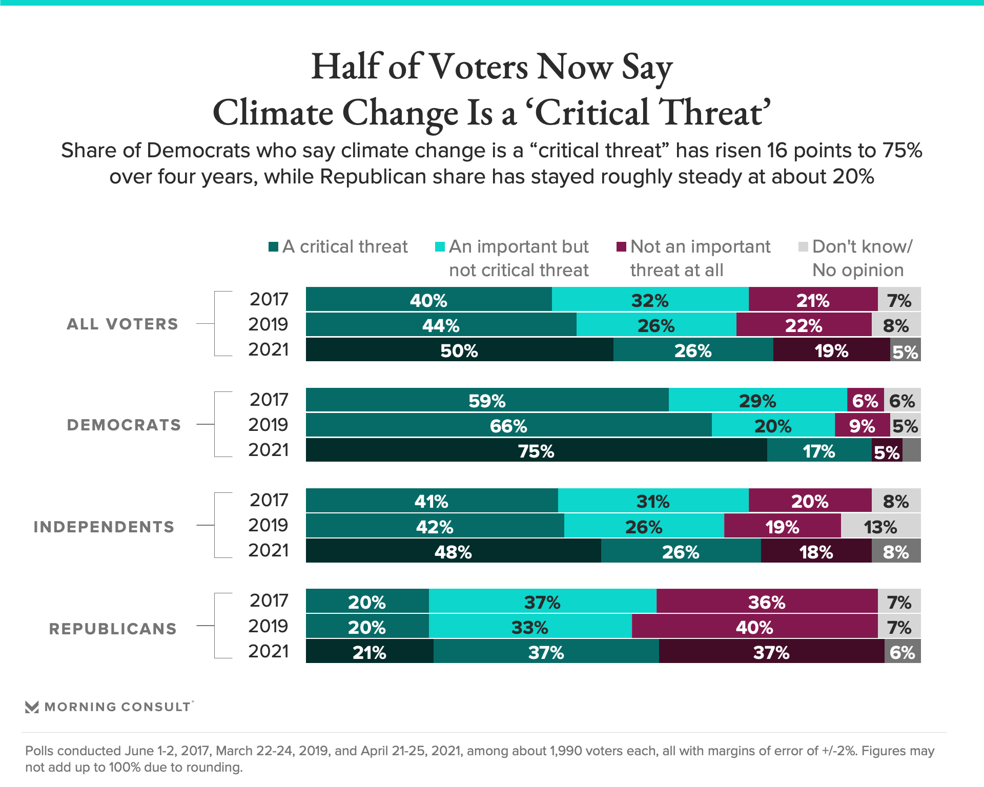The share of voters who said the climate threat is critical is up 10 percentage points from 2017 and up 6 points from 2019.
