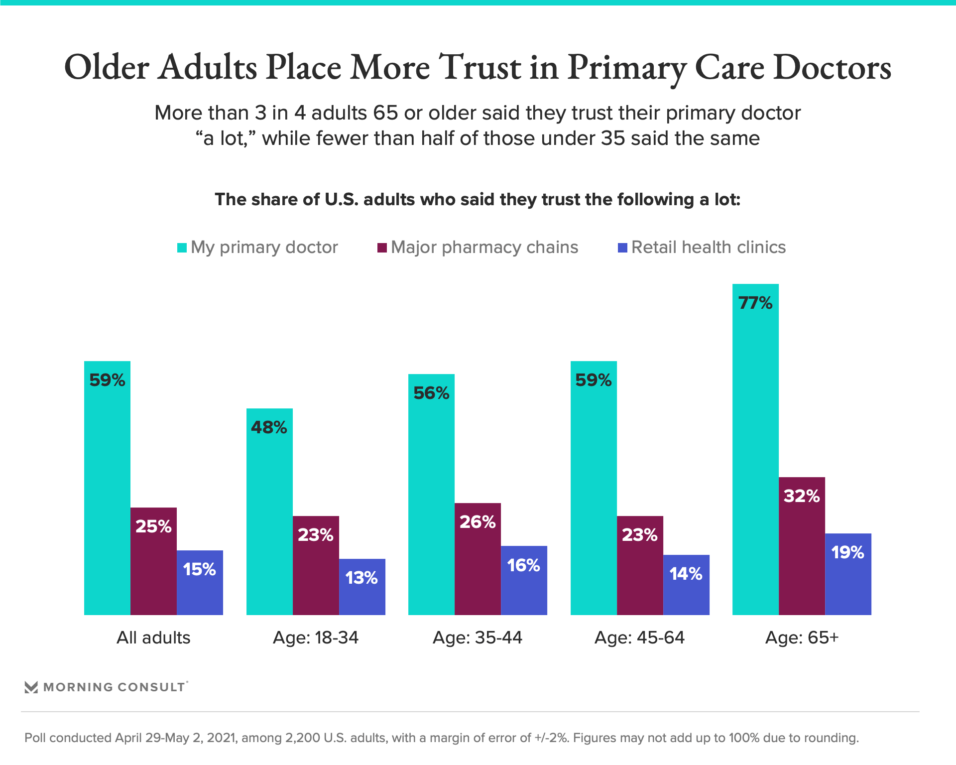 As a whole, 3 in 4 of adults said they at least somewhat trust the health care industry, though younger adults were less likely than older adults to say they trust the industry, their primary doctors, retail clinics or pharmacies.