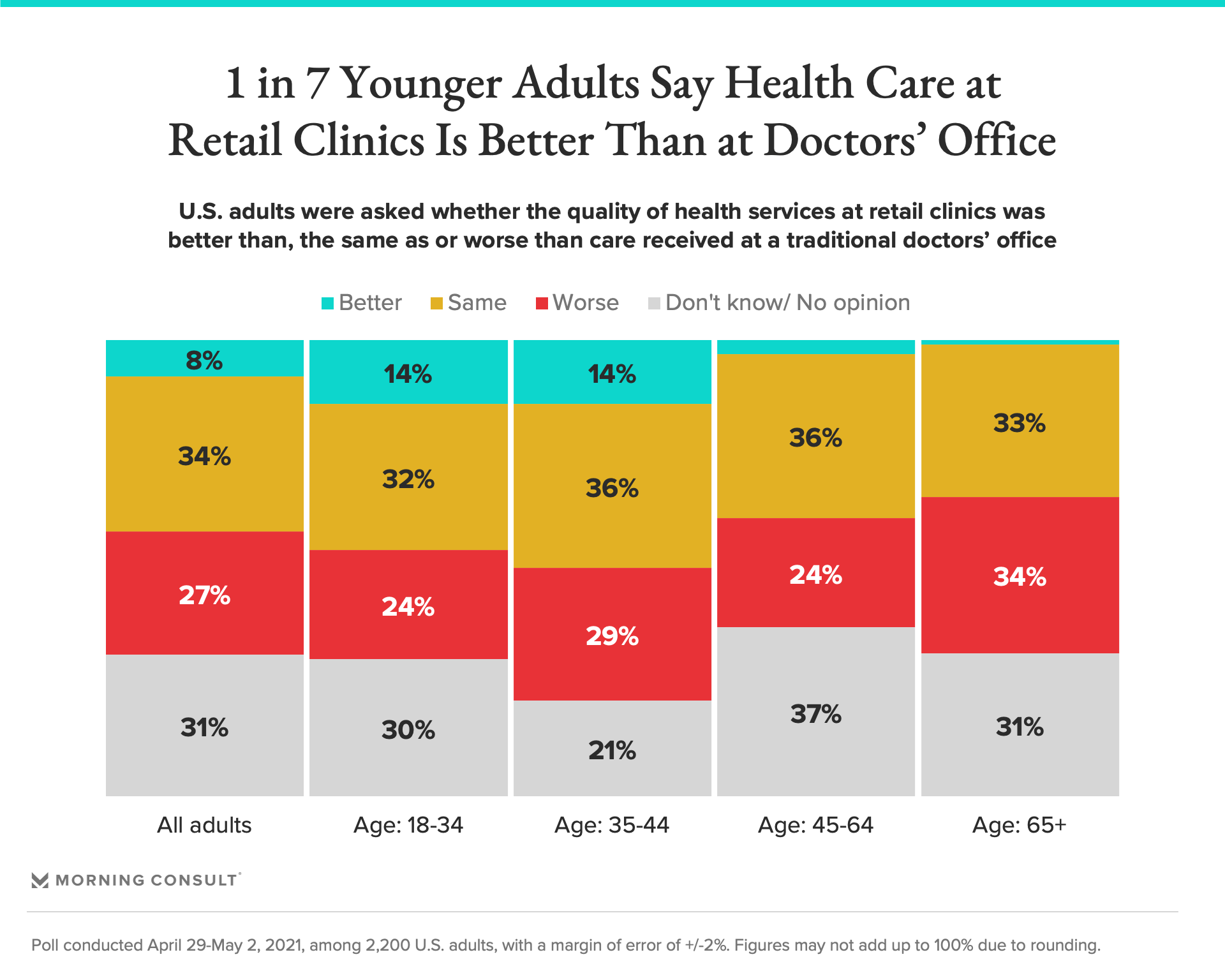 In the Morning Consult survey, conducted April 29-May 2 among 2,200 U.S. adults, 42 percent said they thought the quality of health care services at a retail clinic was either the same or better than the quality of care at a traditional doctors’ office, while another 27 percent said they thought care quality was worse at retail clinics.