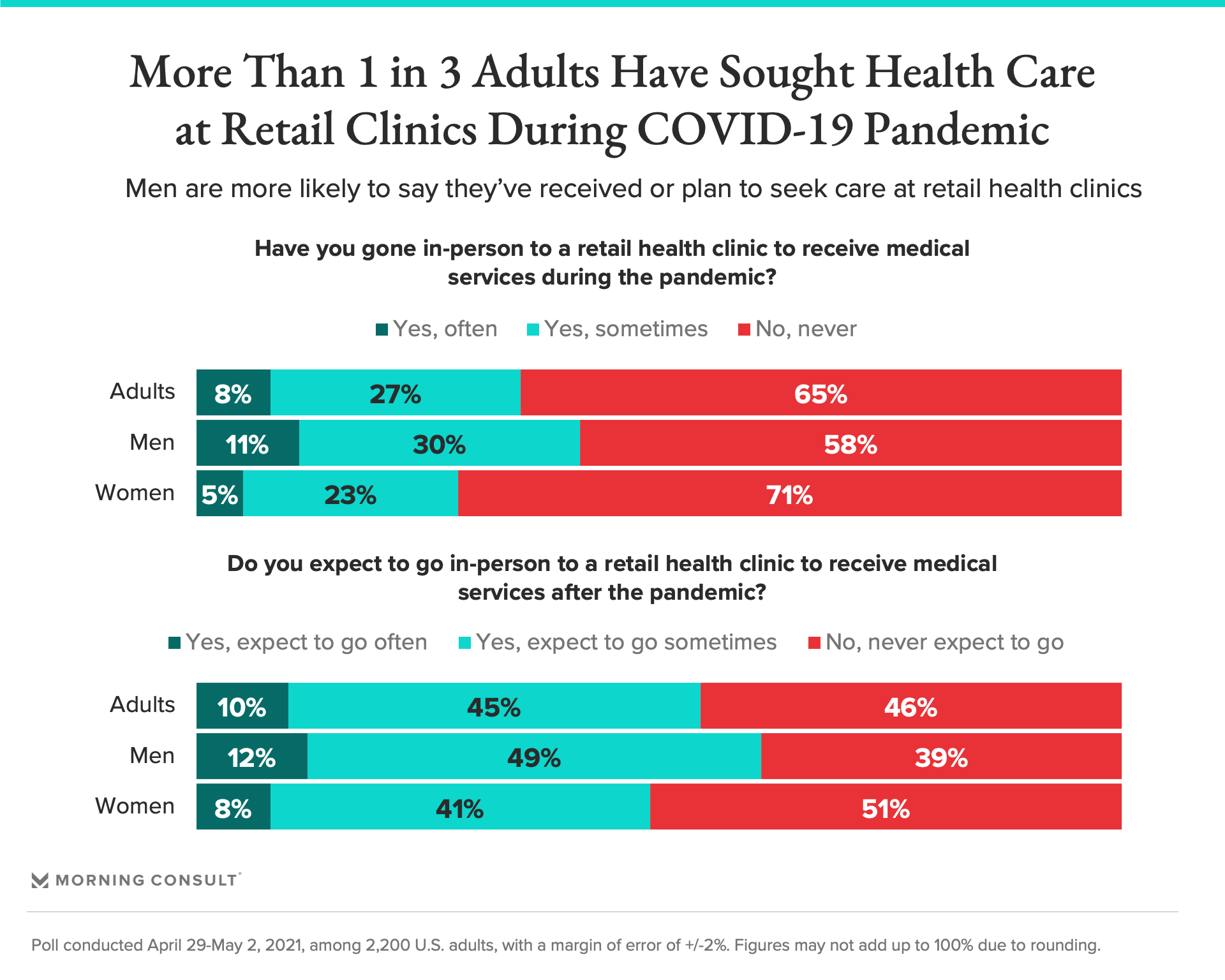 Even before the pandemic, retail clinics’ collective health care footprint was growing. A FAIR Health Inc. report found that retail clinic use rose 39 percent from 2018 to 2019. And early data indicates this shift has continued: 35 percent of adults said they received care at a retail health clinic during the pandemic, while 55 percent said they plan to do so in the future, according to a new Morning Consult survey.