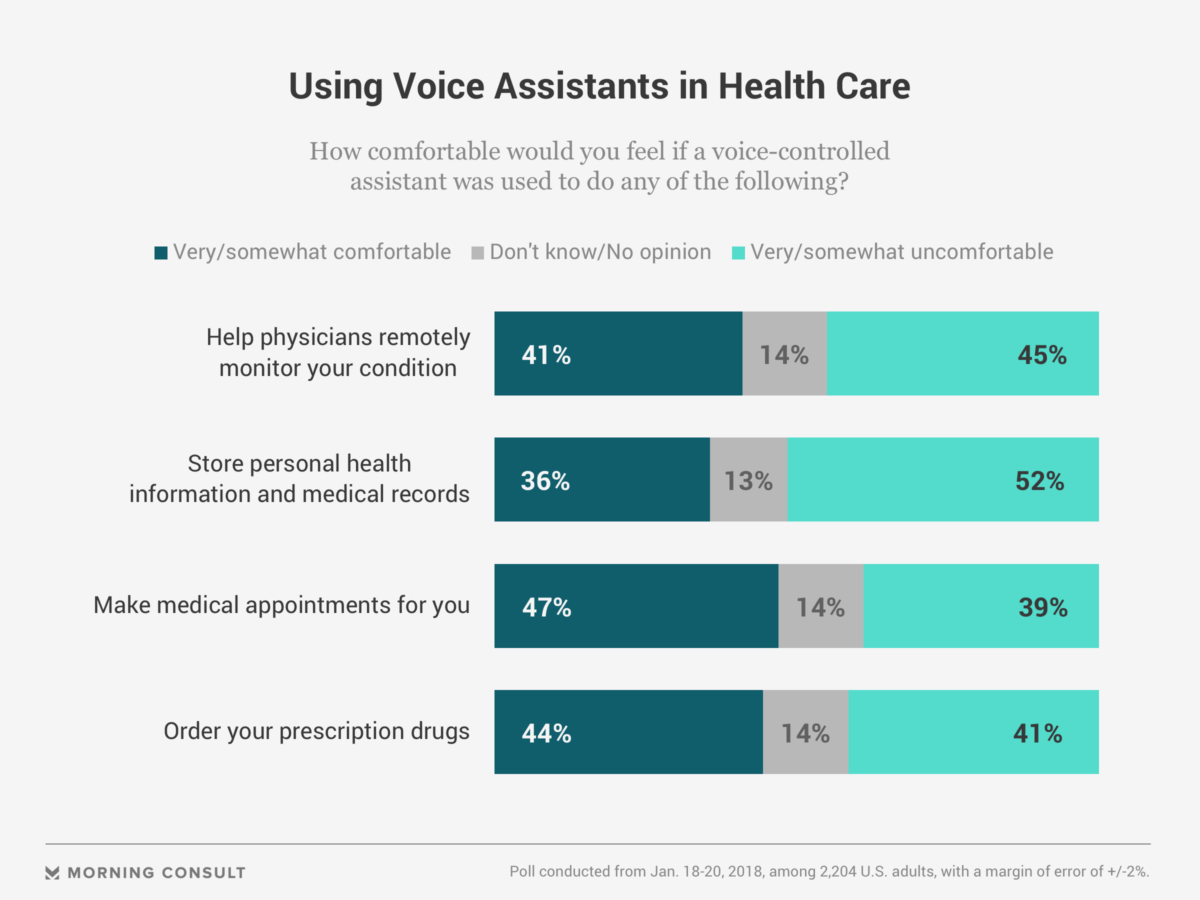 - 52% said they would be uncomfortable with voice assistants storing their medical records; 36% would be comfortable