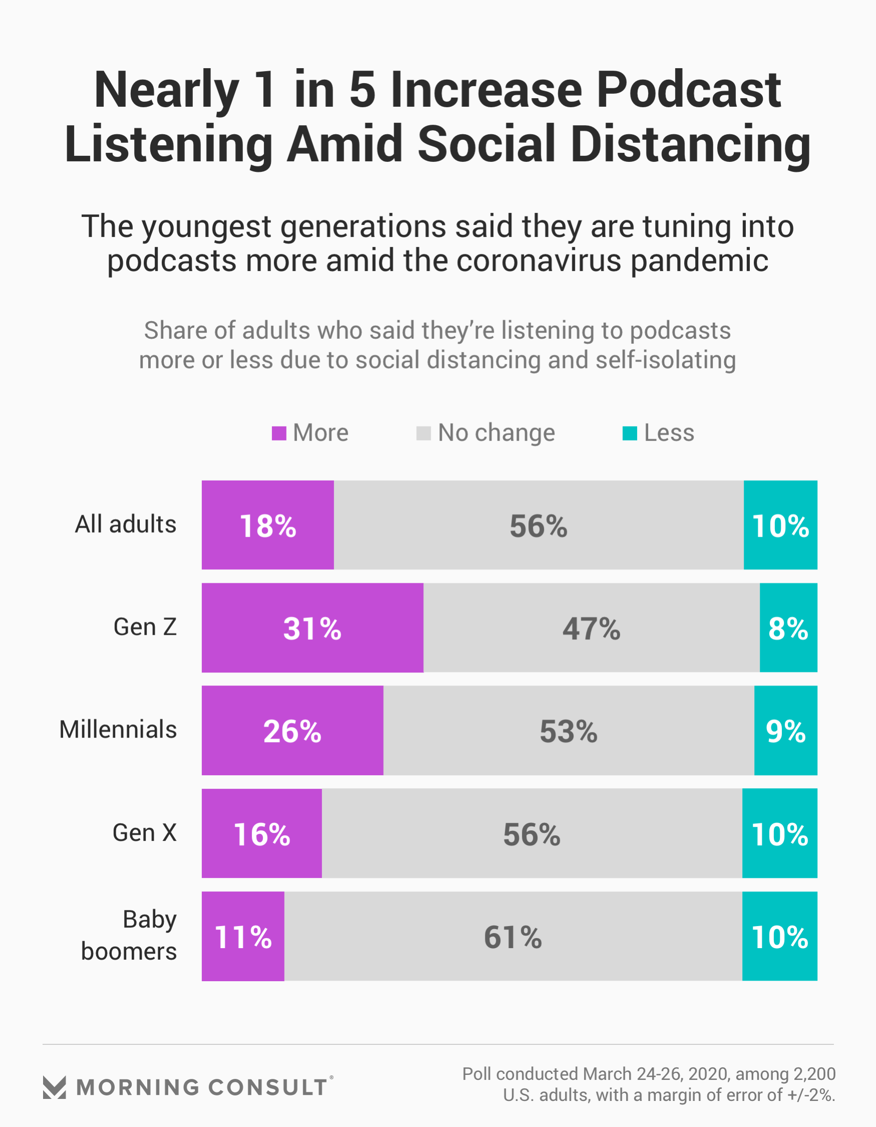 According to the Morning Consult survey, 31 percent of Generation Z (ages 18-22), 26 percent of millennials (ages 23-38) and 16 percent of Generation X (ages 39-54) say they are listening to podcasts more. The survey was conducted among 2,200 U.S. adults with a margin of error of 2 percentage points.