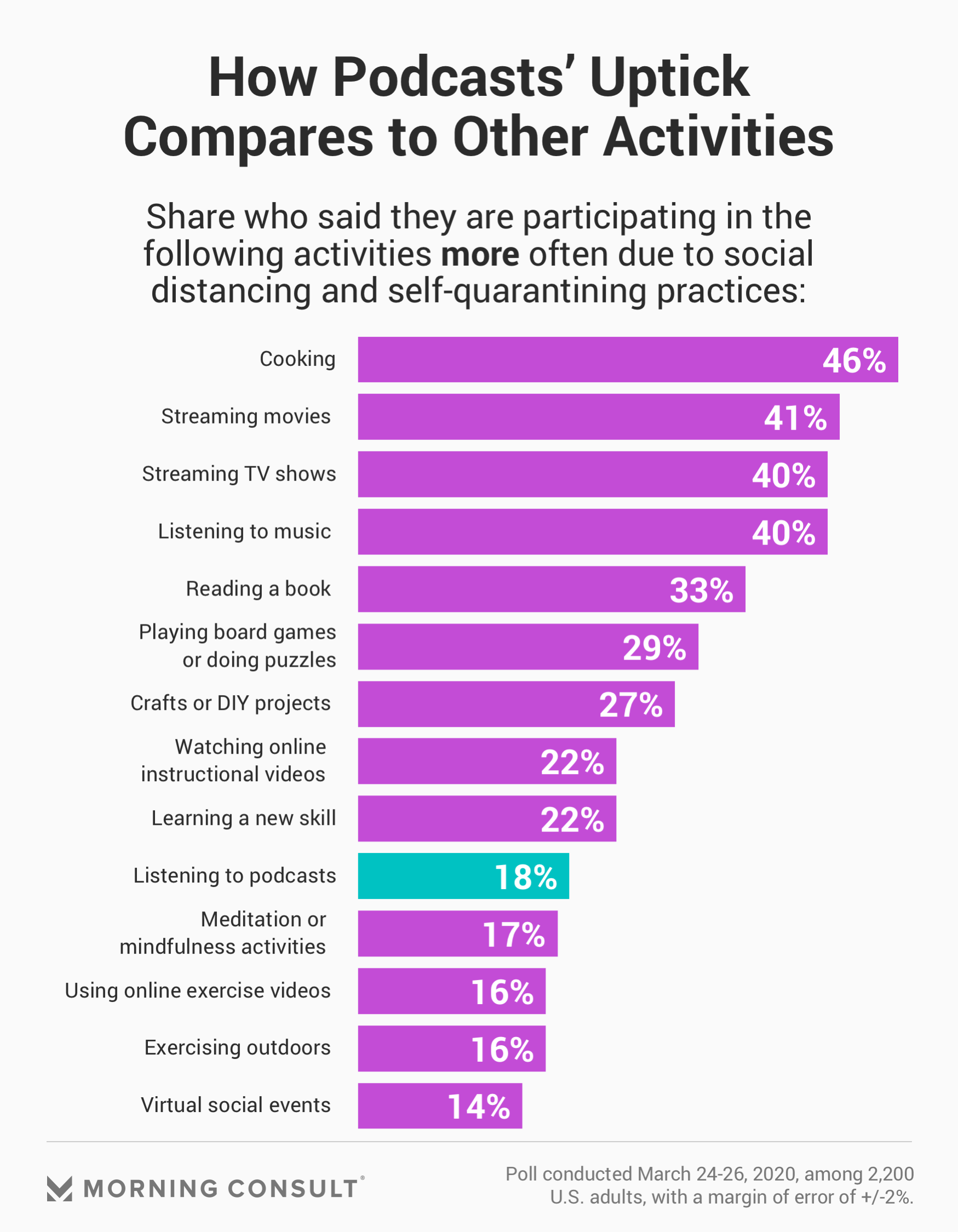 Eighteen percent of U.S. adults said they are listening to podcasts more than they did before they started social distancing and self-isolating, per a March 24-26 poll conducted by Morning Consult, while 10 percent said they’re listening less, creating a net increase of 8 percentage points.