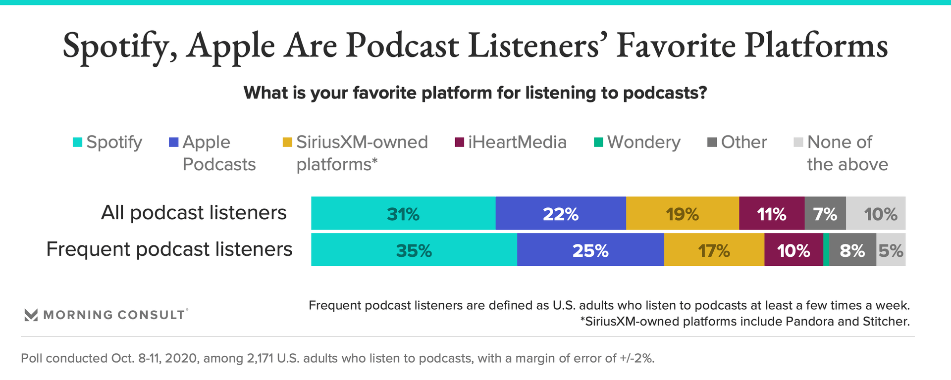 Thirty-one percent of podcast listeners said Spotify is their preferred podcast platform, followed by Apple, SiriusXM and SiriusXM-owned Pandora and Stitcher, and iHeartMedia.
