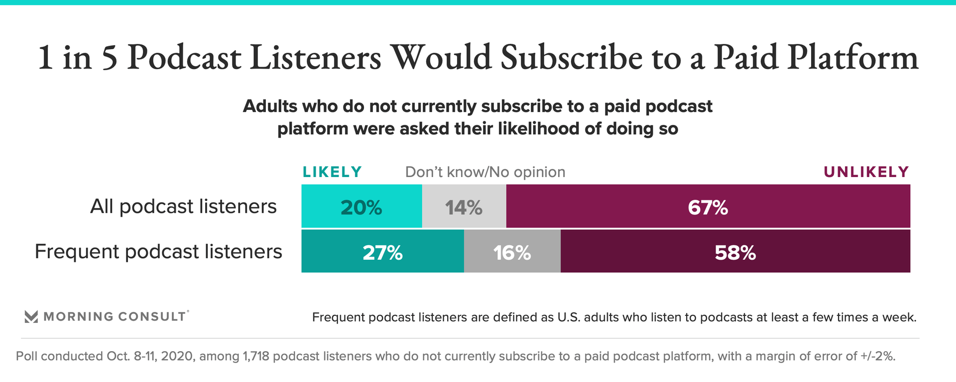 For this reason, podcast company executives said, shifting from an advertising-based business model to one more equally reliant on subscriptions will take at least a few more years, if not longer. But podcast platforms, as well as Morning Consult data, have identified potential demand for paid services right now and what drives people to pay.