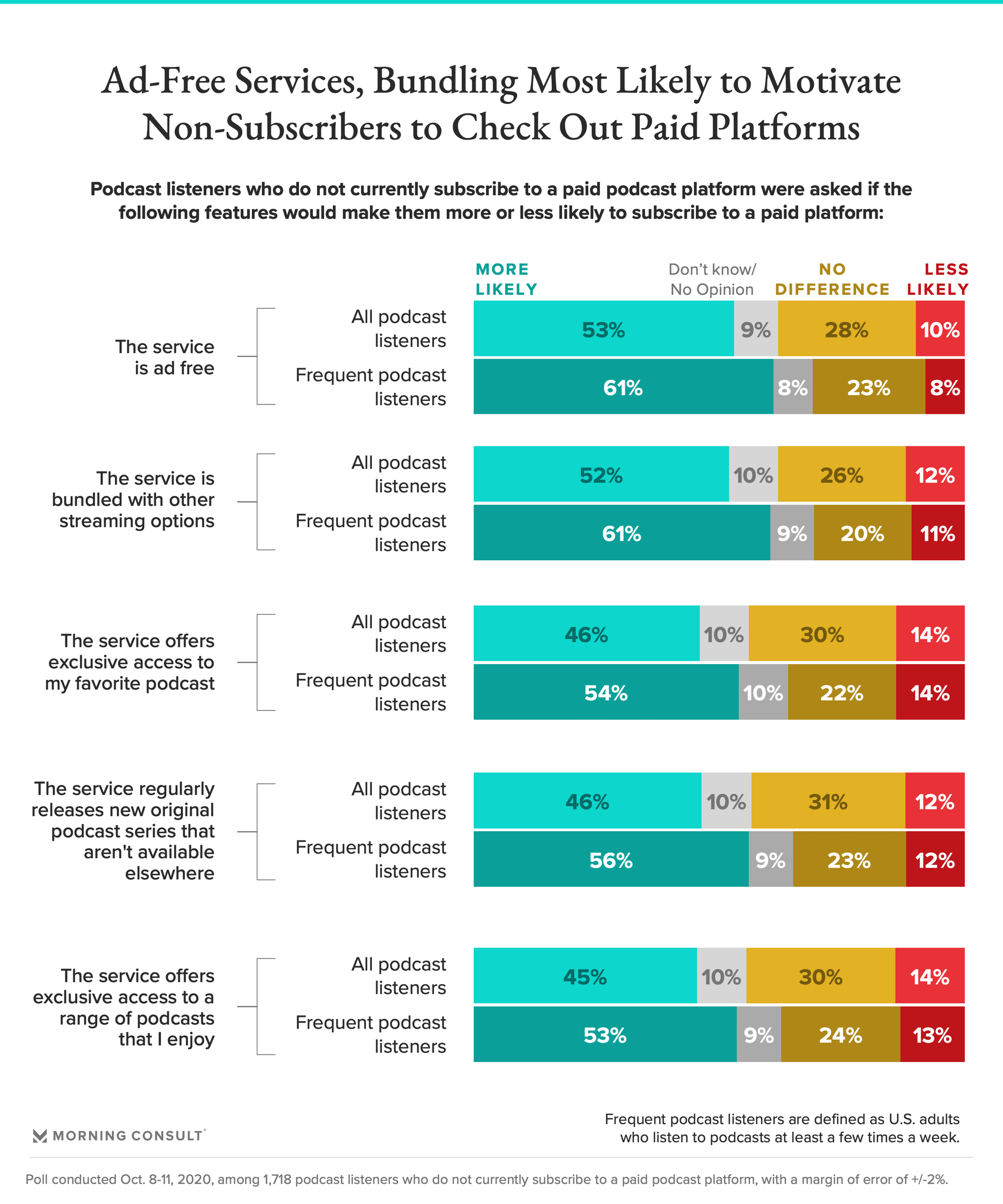 Ad-free podcasts and bundling were the most attractive features in a paid product to podcast listeners, according to Morning Consult data.