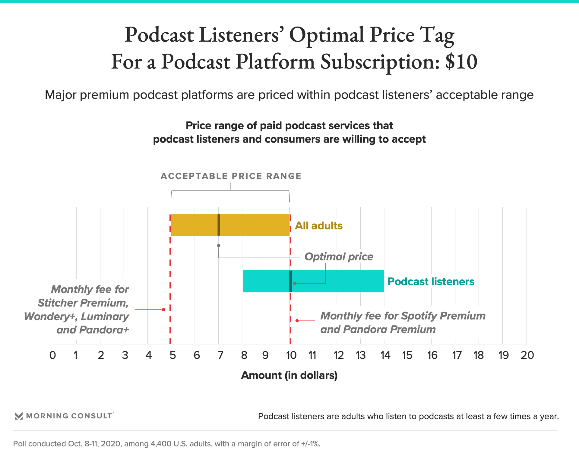 The Morning Consult survey used the Van Westendorp model, which finds an optimum price point for a service by considering what prices consumers believe are “too expensive” and “too good to be true,” to find the ideal price point for a paid podcast subscription.