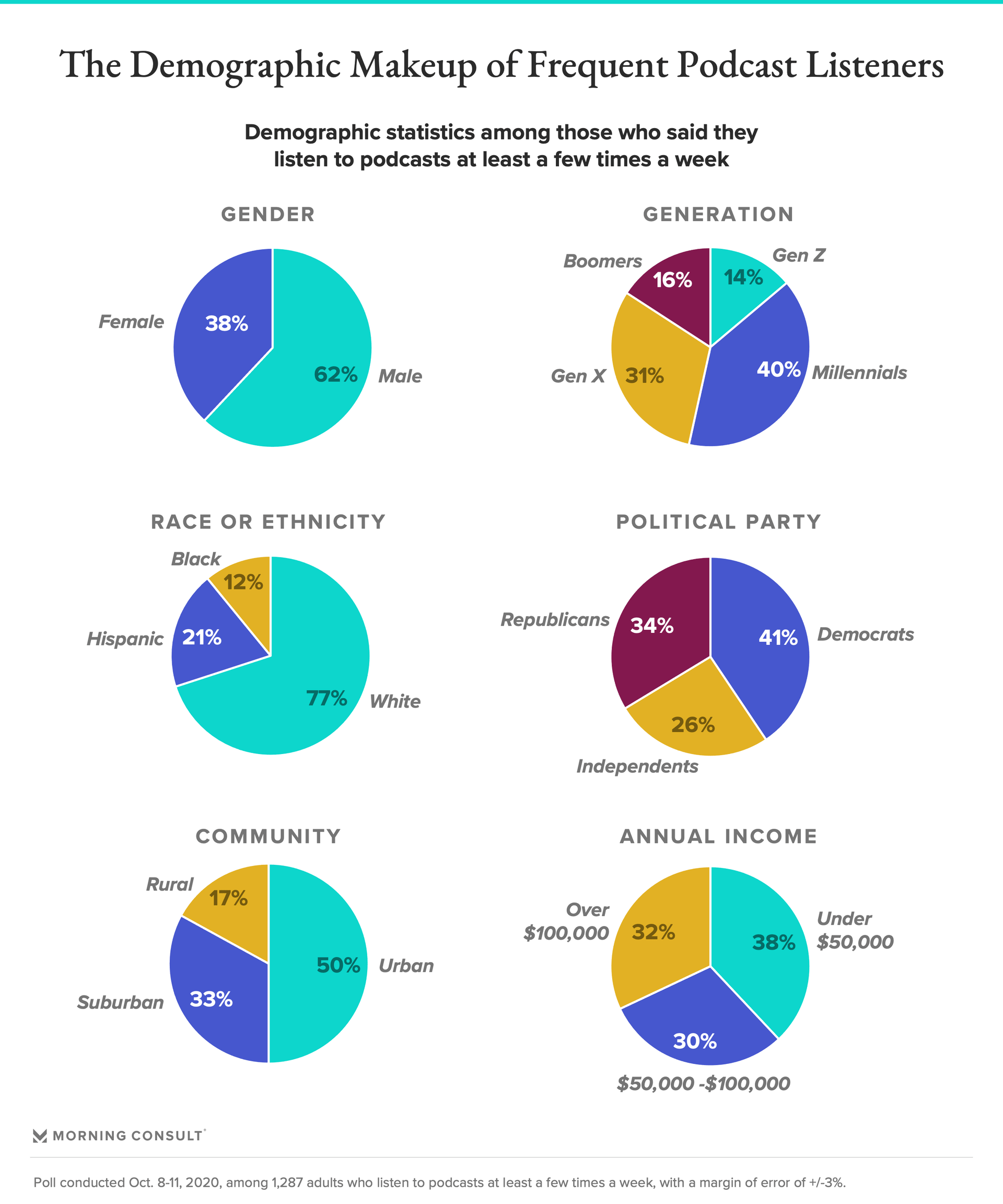 Frequent podcast listeners tend to skew more male and significantly more white, according to an Oct. 8-11 Morning Consult survey conducted among 1,287 adults who said they listen to podcasts at least a few times a week. Millennials also listen more than other generations, while Democrats tune in more than Republicans.