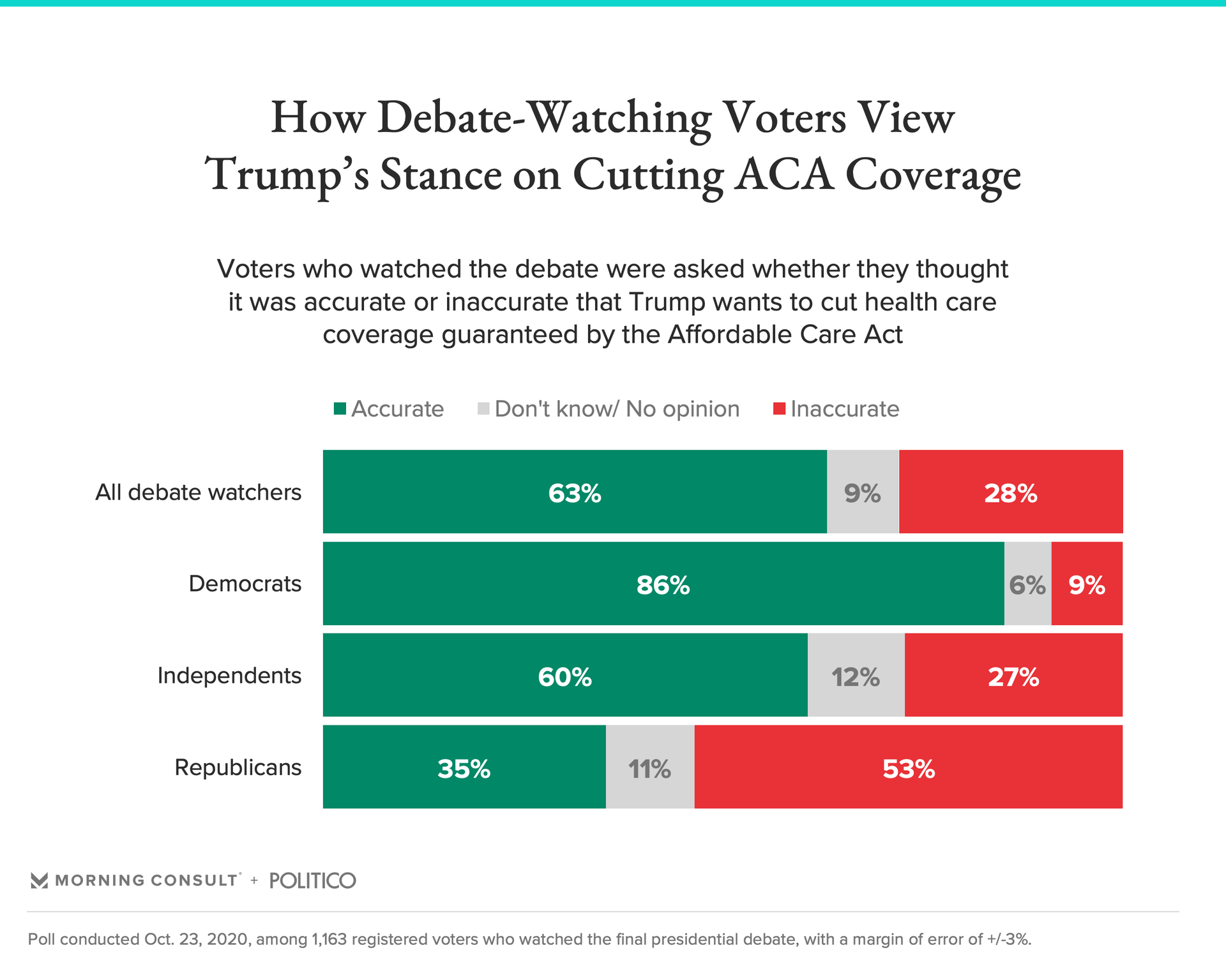 - 63% of voters who watched the debate say Trump wants to cut health coverage guaranteed by the ACA, while 28% say he doesn’t.