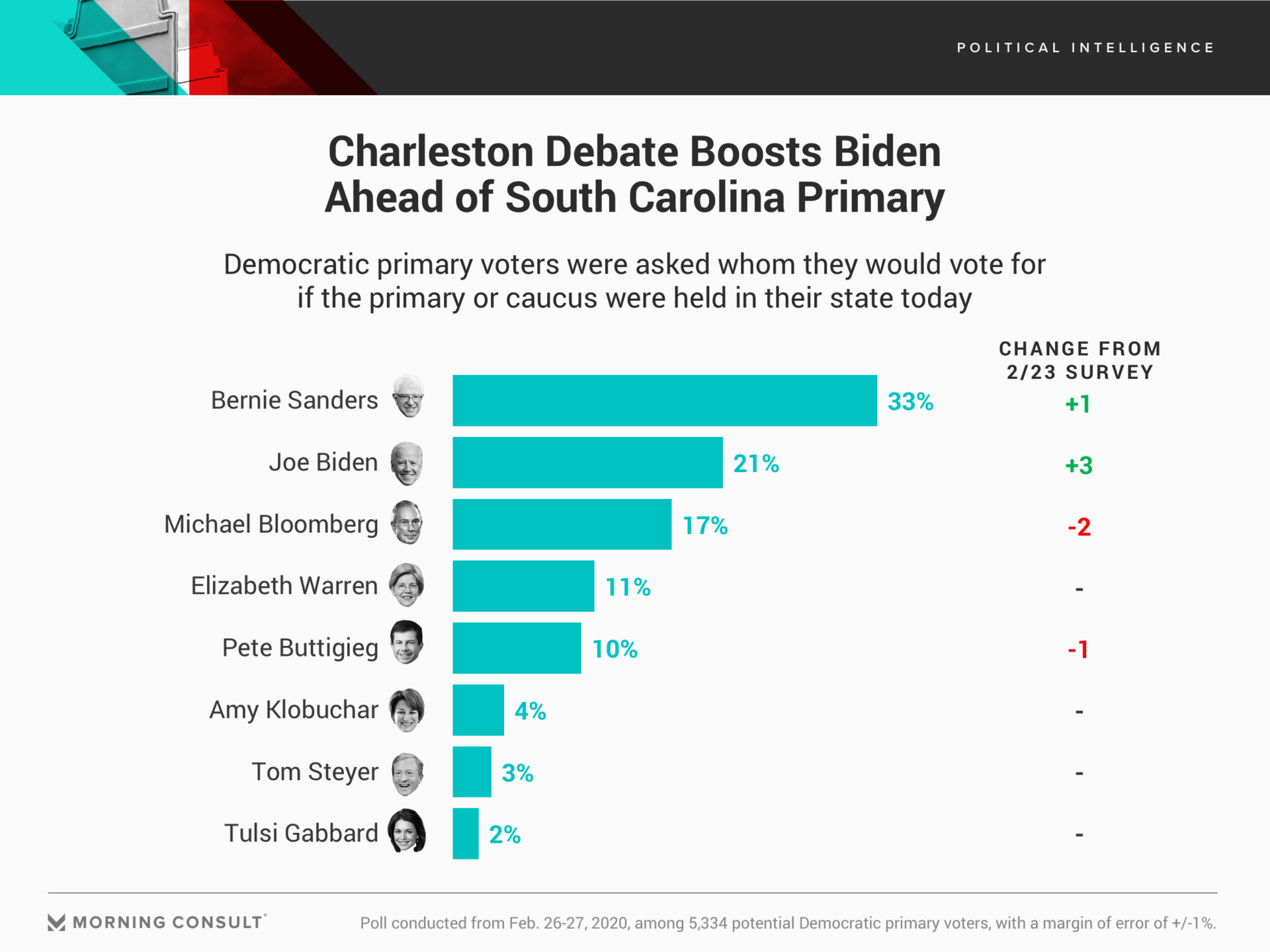 Former Vice President Joe Biden received his best reviews of the 2020 cycle for his debate performance on Tuesday in Charleston, and primary voters nationwide appear to have taken notice. Biden saw his support increase by 3 percentage points in the two days following the debate, the biggest movement Morning Consult measured during the time period.