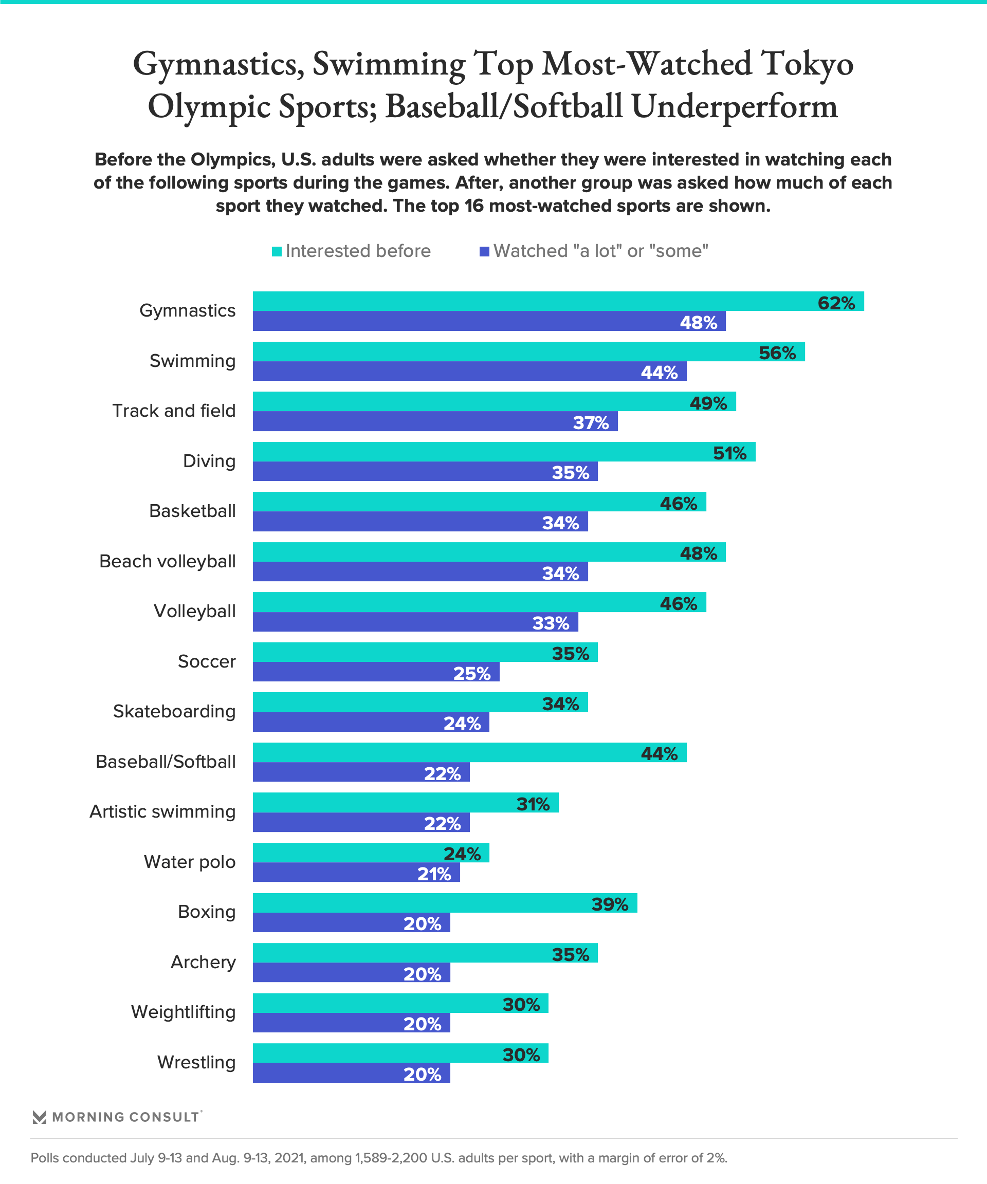 As expected, swimming and gymnastics were the most-watched sports, according to the August survey, with 48 percent and 44 percent of U.S. adults, respectively, saying they watched “a lot” or “some” of each.