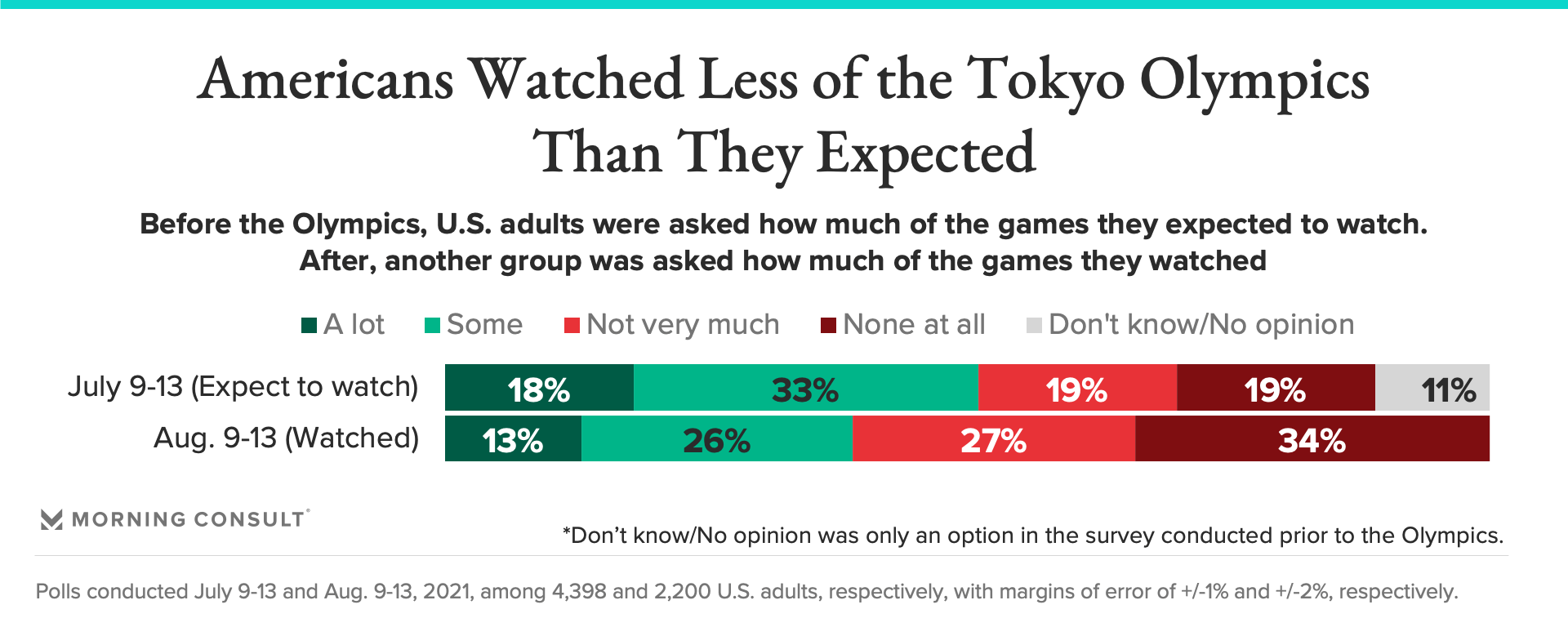 On the other side of the spectrum, the 61 percent who said they watched “not very much” or “none” of the action from Tokyo far exceeded the 38 percent who said in the July survey they didn’t expect to watch much or any of the games.