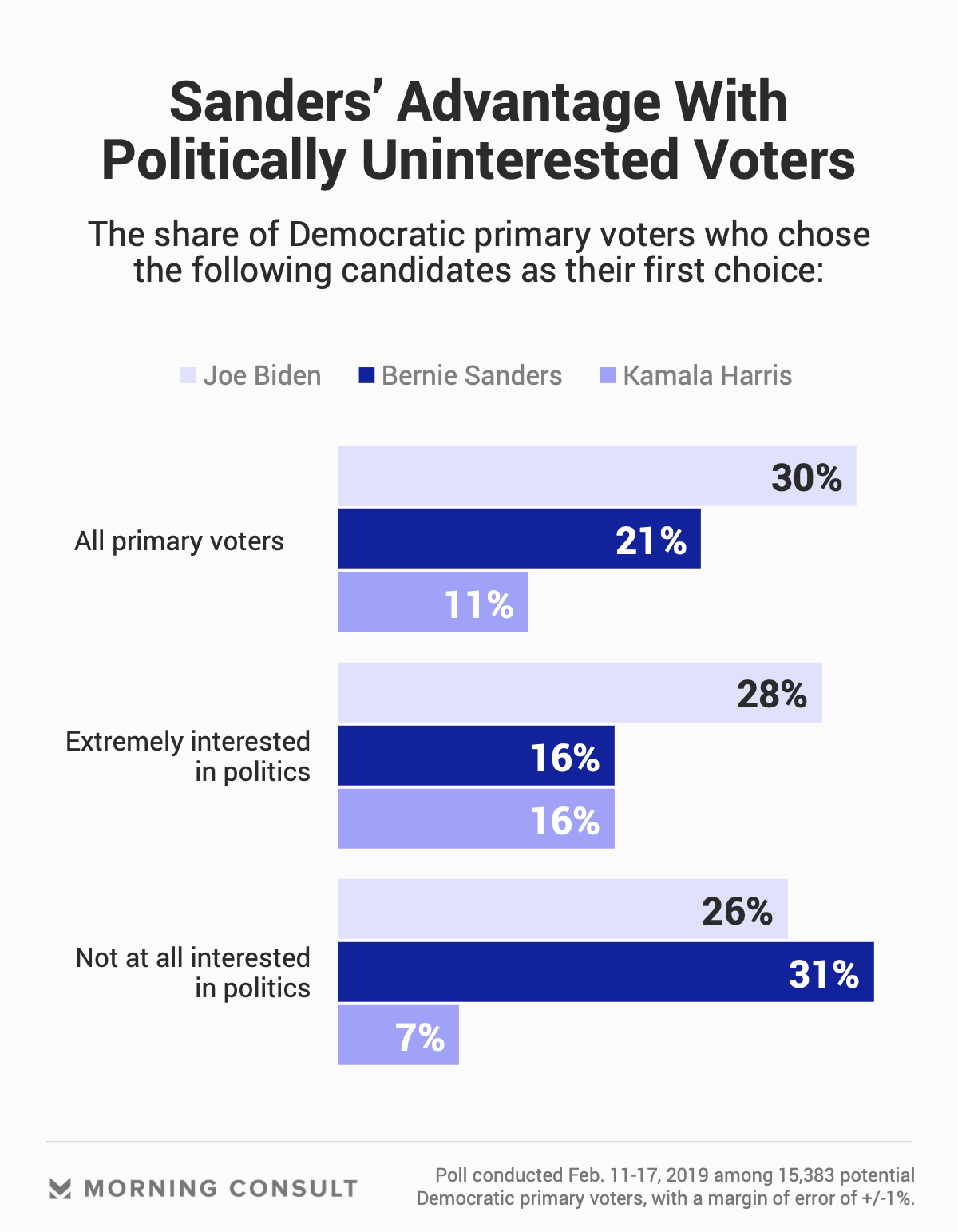 - 31% of Democratic primary voters who said they weren’t “at all interested” in politics or public affairs are backing Sanders, best in the field.