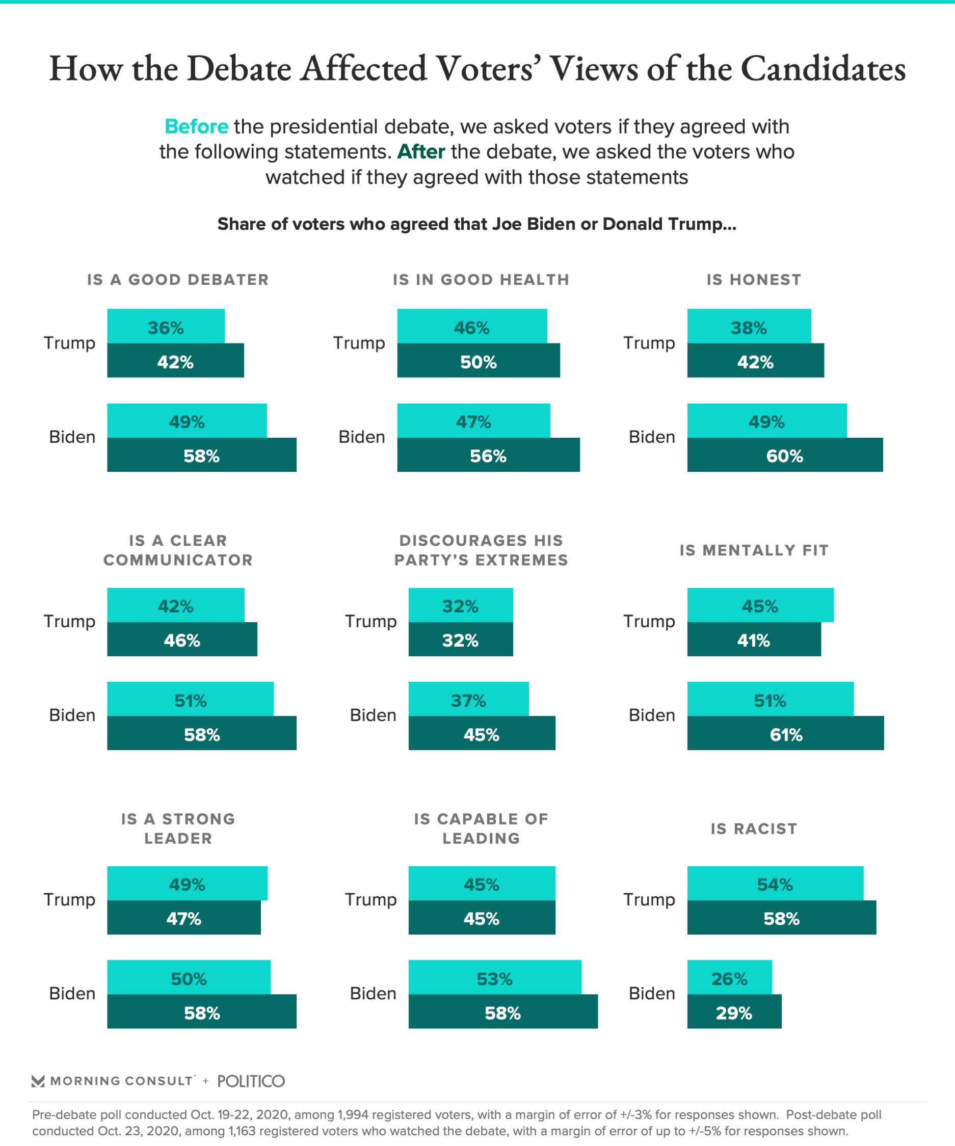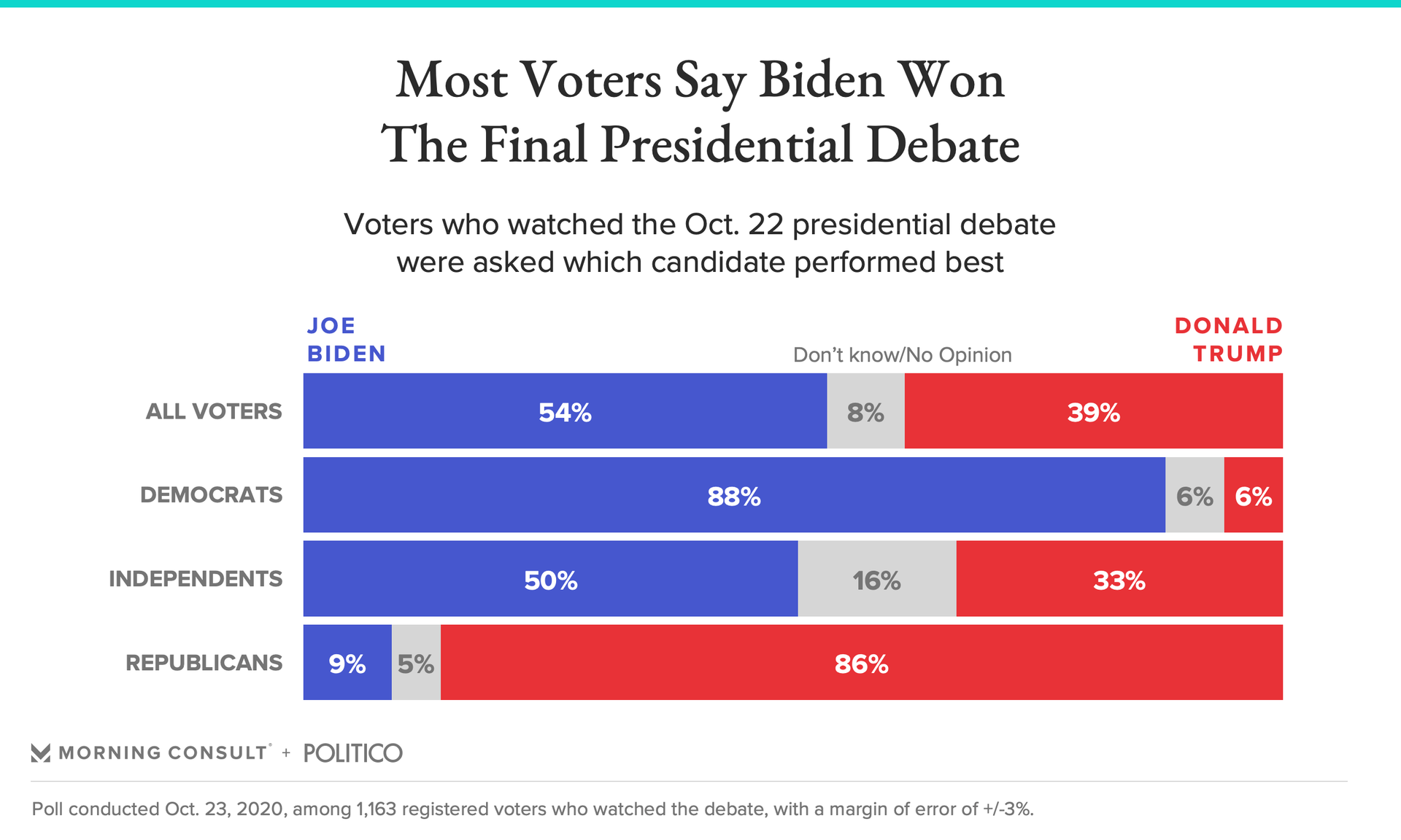 According to a Morning Consult/Politico poll conducted Oct. 23, 54 percent of voters who tuned in Thursday night thought Biden performed best, while 39 percent said the same of President Donald Trump. The margin of victory of 15 percentage points for Biden is similar to the 16-point gap from polling conducted among viewers of the fractious, Sept. 29 televised contest.