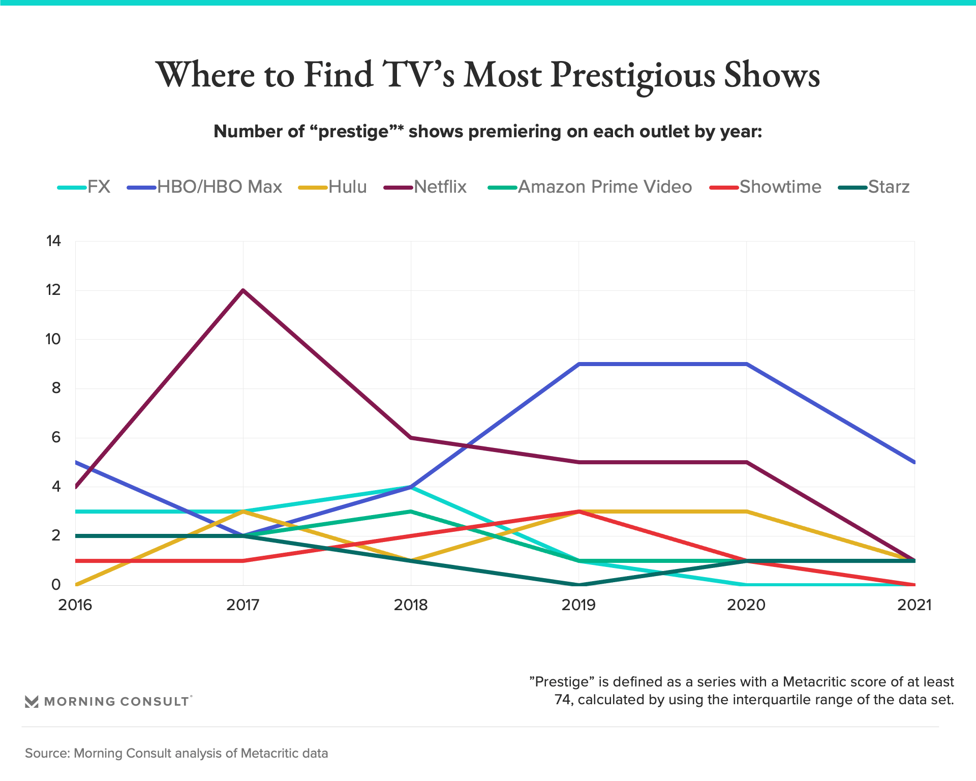 Across the industry, the volume of prestige TV decreased over the past six years, per Morning Consult’s analysis of Metacritic data. In 2016, a total of 33 shows across 17 outlets qualified as prestigious. That number fell to 18 shows across 10 outlets so far this year as pandemic-related production delays have hampered companies’ ability to churn out high-quality shows at a consistent rate.