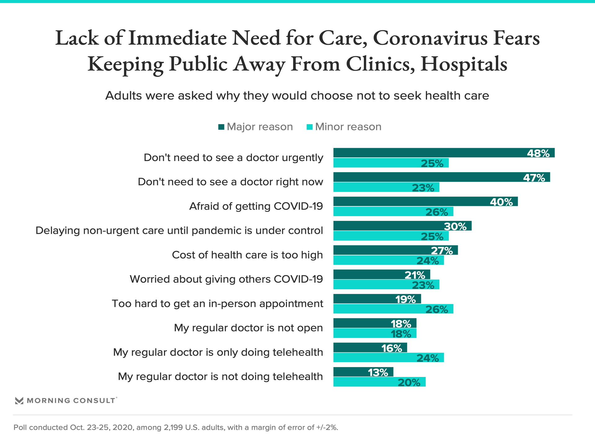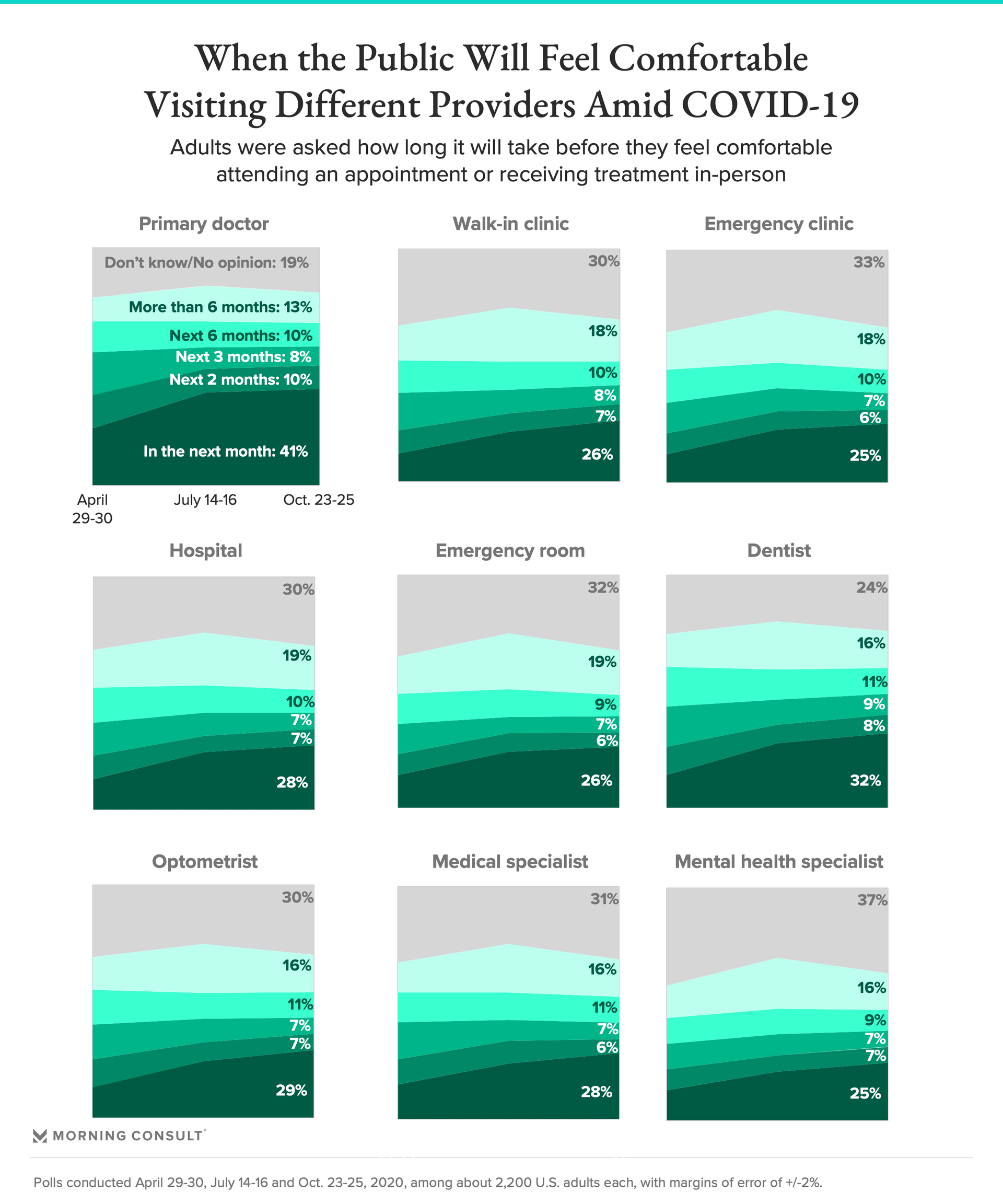 Yet a new Morning Consult poll indicates that while most of the public would be comfortable seeing their primary doctor for care unrelated to COVID-19, many are hesitant to go to the emergency room or see other types of providers, including mental health specialists, with little change since a July survey on the matter. The findings are another “canary in the coal mine” that the health care landscape has been altered for the foreseeable future — perhaps permanently — and that the industry should rethink its approach to health care access during the pandemic and beyond, public health advocates and medical professionals said.