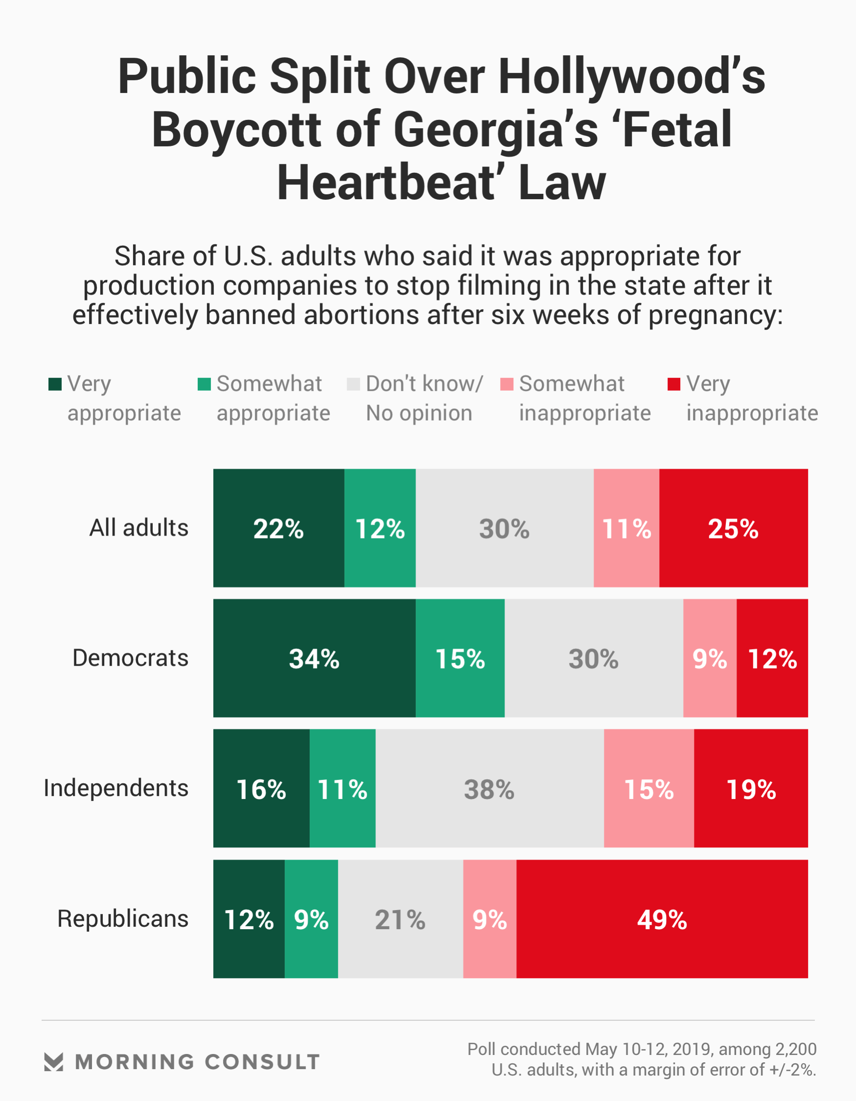 The public is split on whether it was appropriate for five production companies, including the firm behind “Vox Lux” and “First Reformed,” to stop filming in Georgia after state lawmakers passed a law that bans abortion after a heartbeat is detected.