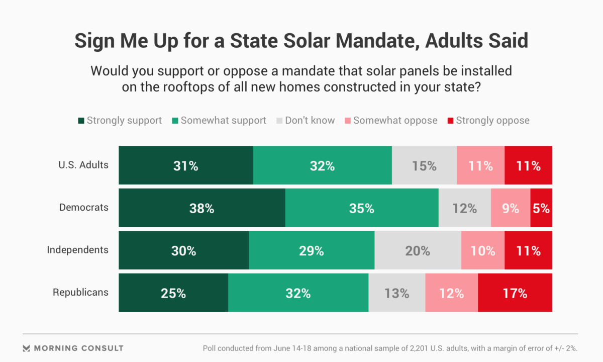 Support for a state home solar mandate was strongest among Democrats, at 73 percent, with 57 percent of Republicans saying they would support one.