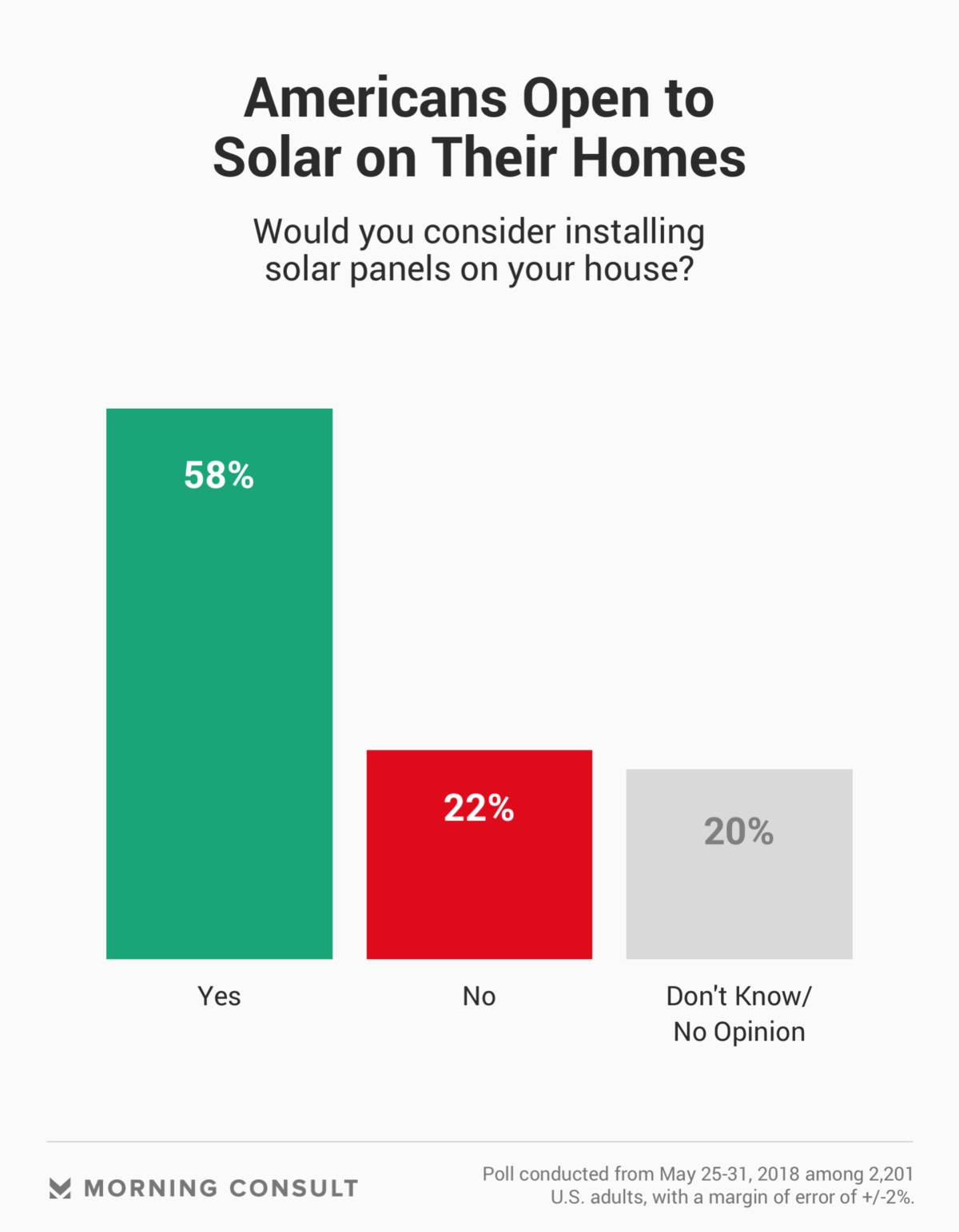 Separate polling from May 25-31 indicated a strong show of support for solar, with 58 percent of U.S. adults saying they would consider installing solar on their houses. Other respondents were closely split between those who said no (22 percent) and those who were unsure or without an opinion (20 percent).