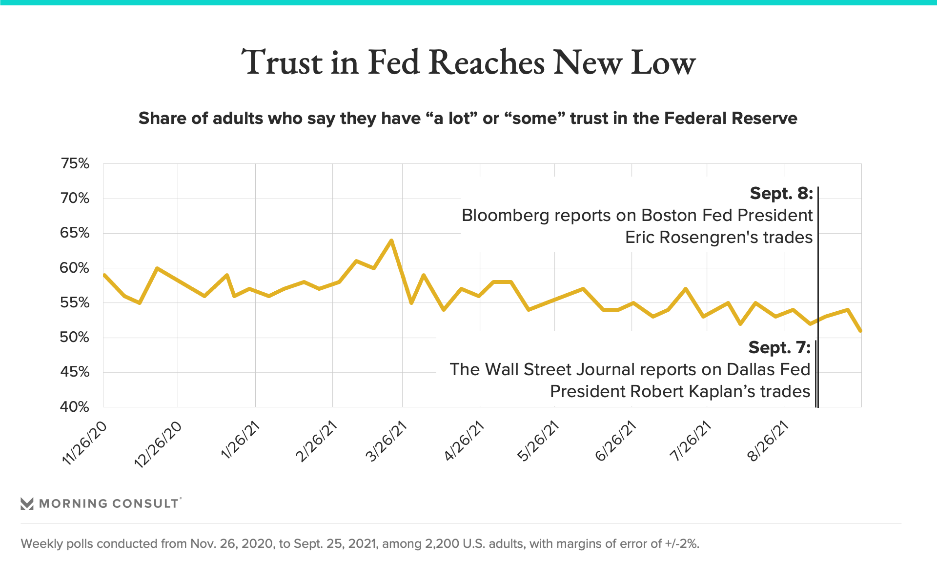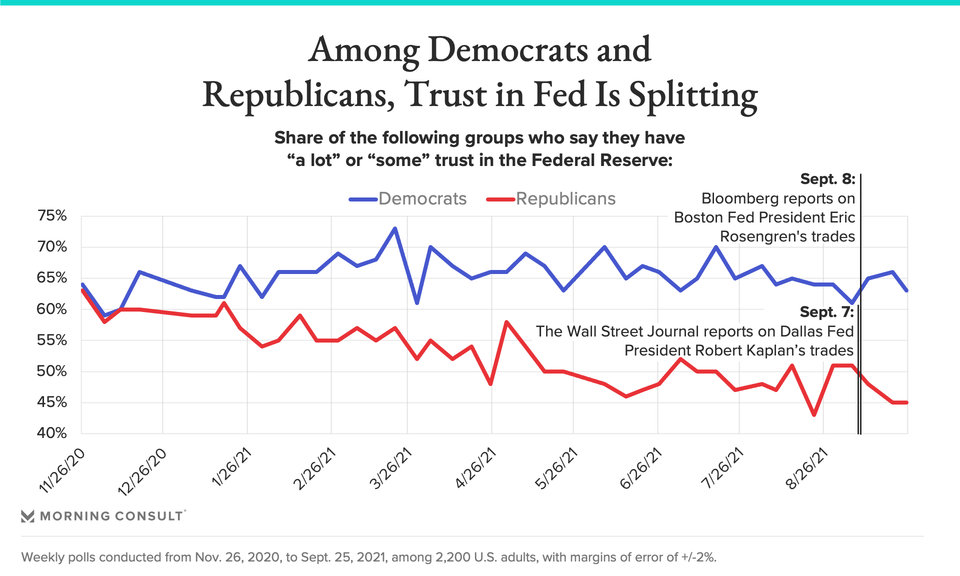 Republican trust in the Fed has dropped 6 points since the trading scandal broke and has fallen 18 points since Morning Consult began tracking the data in November 2020.