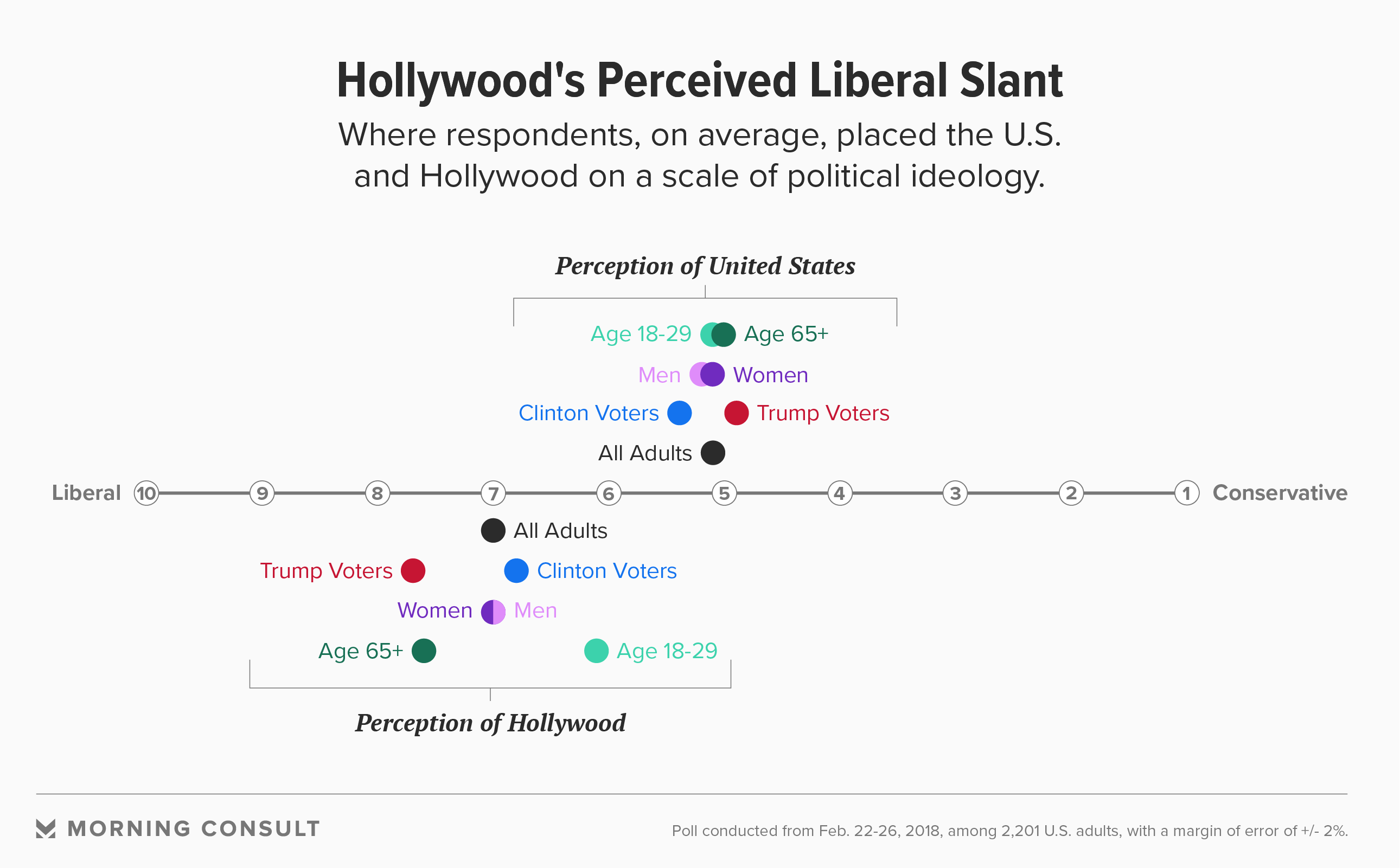 In a survey conducted Feb. 22-26, respondents were asked to gauge the public’s ideology on a scale of one (conservative) to 10 (liberal). Responses for the country's political leanings were almost squarely in the middle, averaging 5.1, whereas perceptions of the entertainment industry drifted more toward the liberal end of the spectrum at 7.