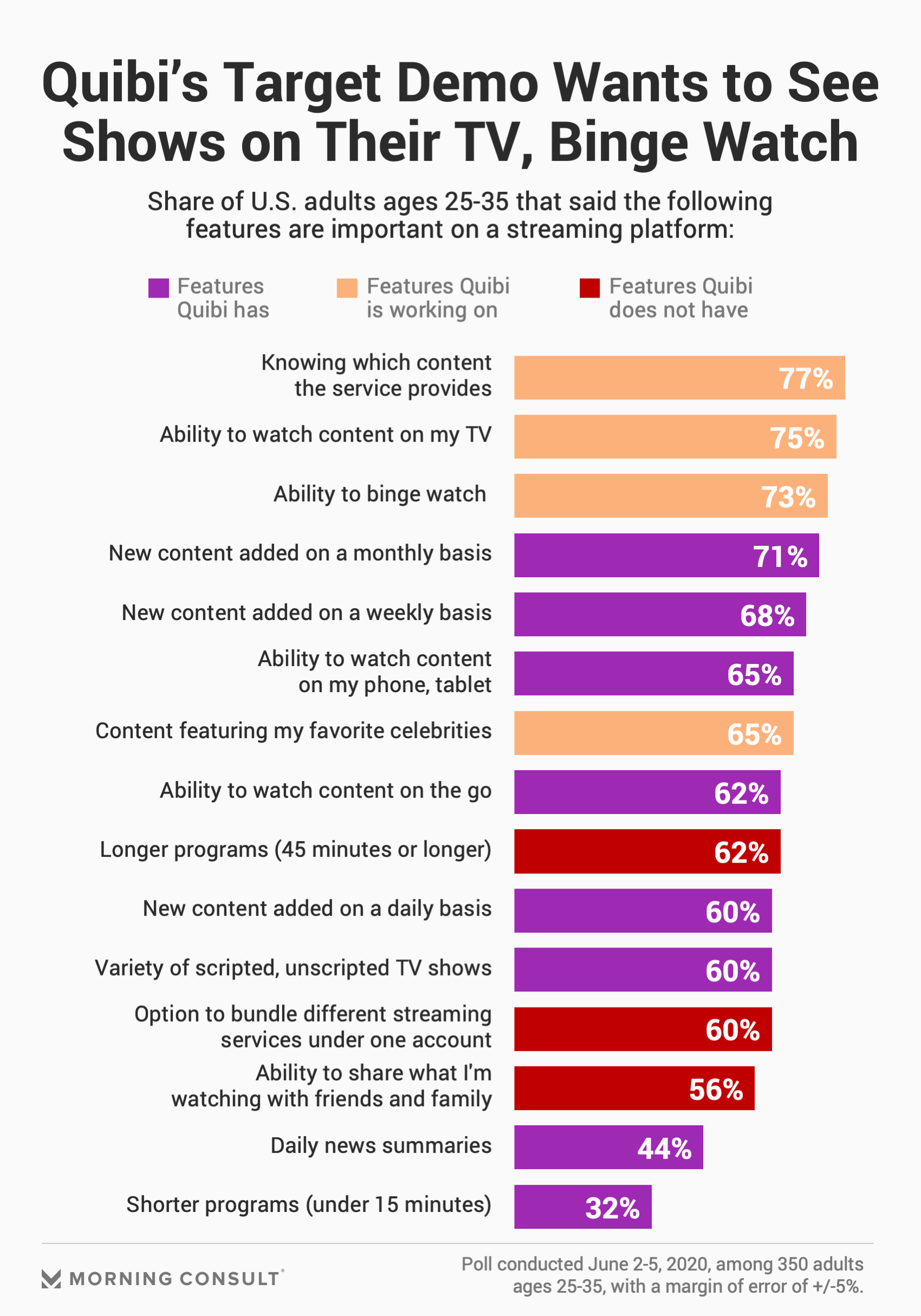 But pandemic aside, new polling finds that many of the features that Quibi touts, such as shorter programing and daily news summaries, do not top consumers’ must-have lists, per a new Morning Consult poll. And some of the most sought-after aspects of a streaming service, such as being able to binge shows and watch programming on their TV, aren’t marquee features.