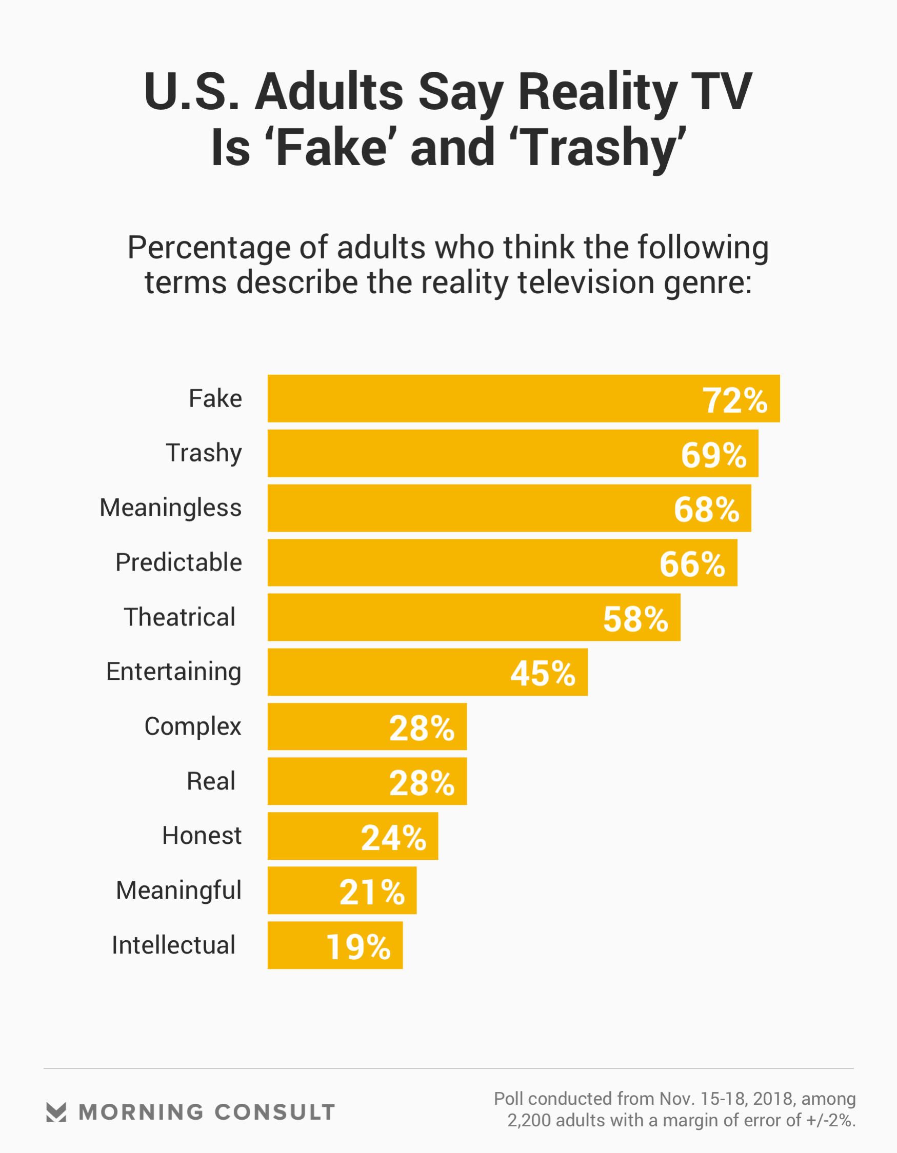 Seventy-two percent of adults said that “fake” was an apt description of reality television, and 66 percent said the shows do not represent American society well.
