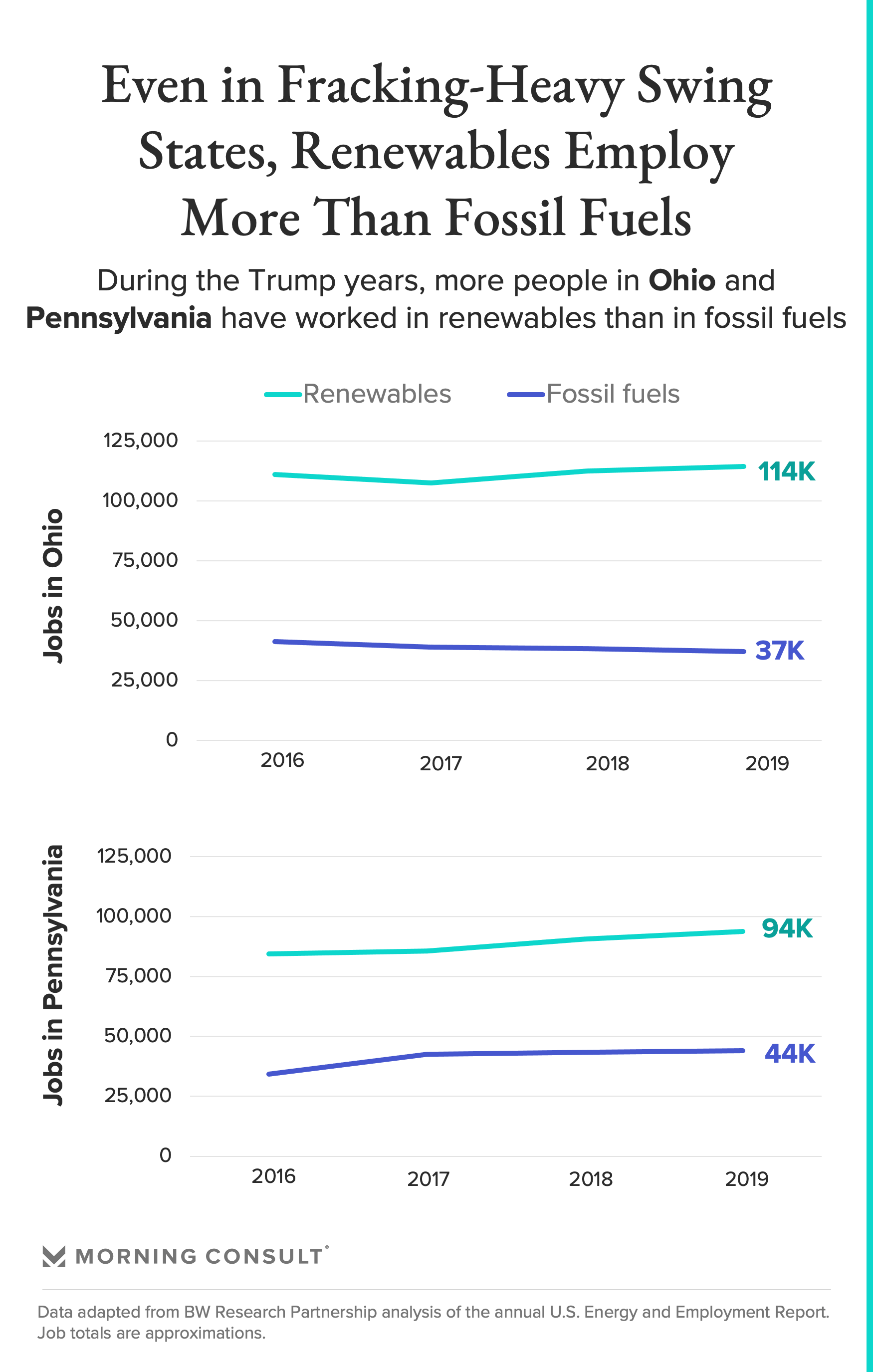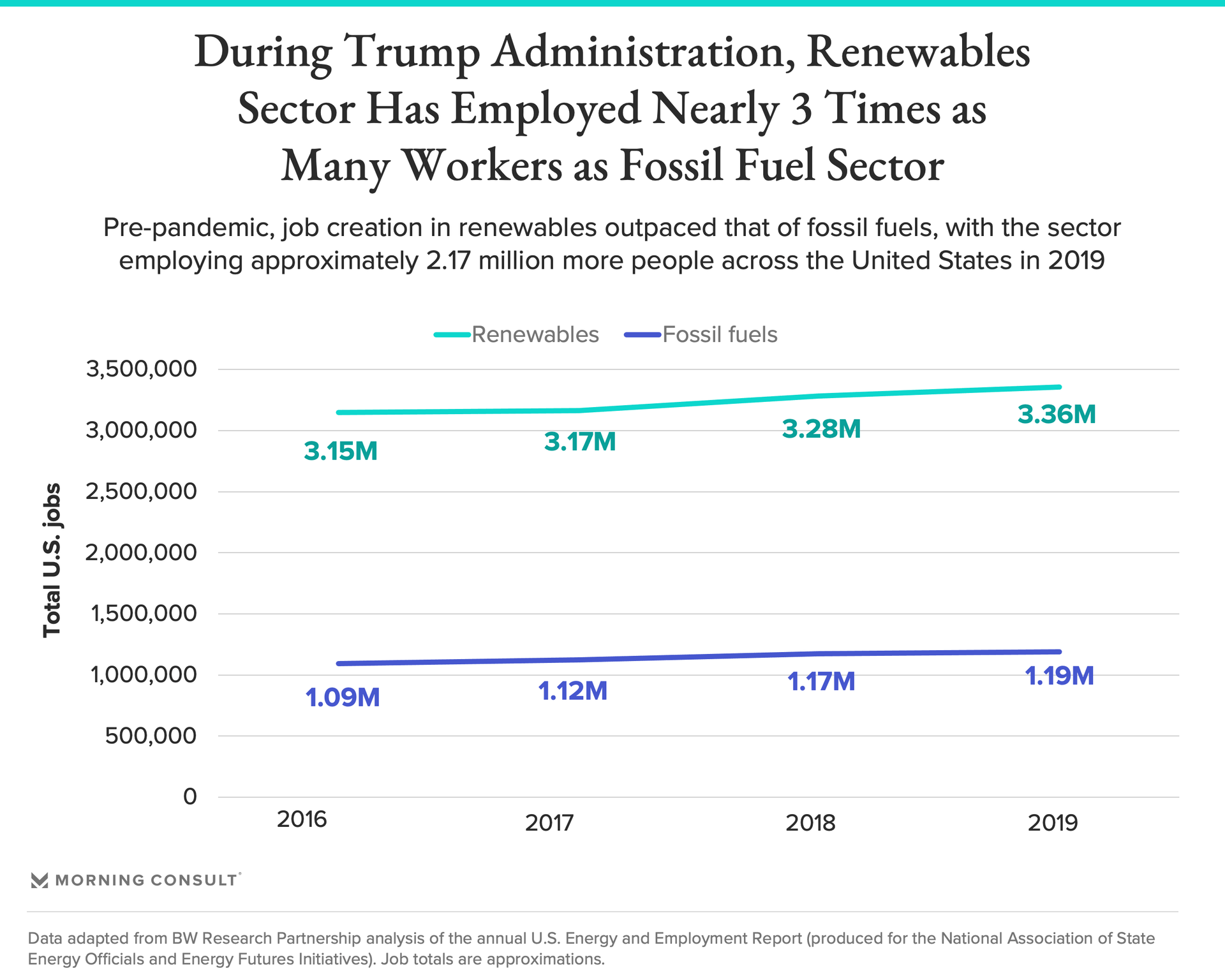 But data collected by BW Research Partnership Inc. and shared exclusively with Morning Consult indicates that Trump’s picture of robust oil and gas employment threatened by the Democrats’ insistence on transitioning to renewables is not consistent with actual job figures. Since the president took office, the renewables sector has employed nearly three times as many people as the fossil fuels sector; in 2019, they had 3.36 million and 1.19 million workers, respectively.