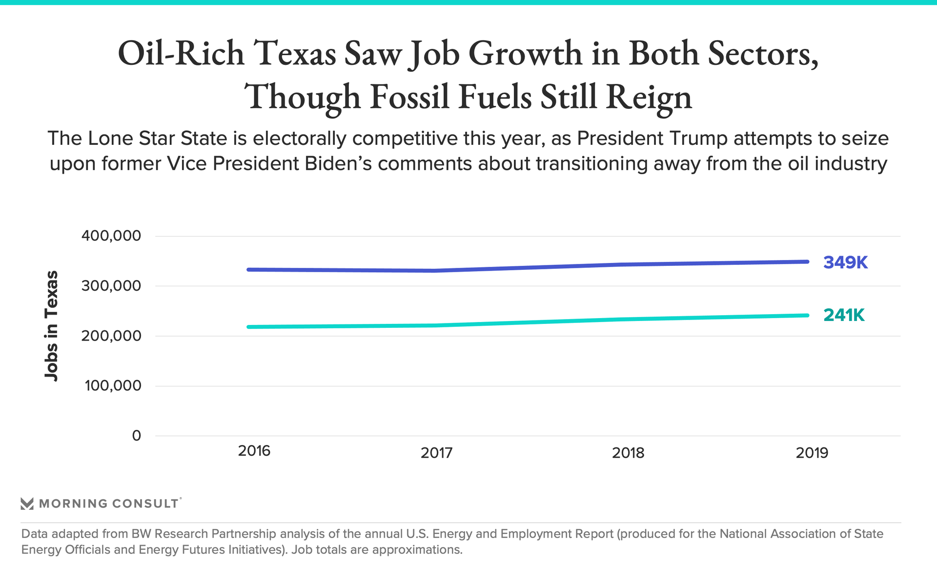 Texas, however, is an example of a state where oil and gas still reign. The Lone Star State has long been both a Republican stronghold and the headquarters of the U.S. oil industry, and fossil fuels employment still edges out renewables by more than 100,000 jobs (roughly 349,000 to 241,000). But this year, things are beginning to change in both respects.